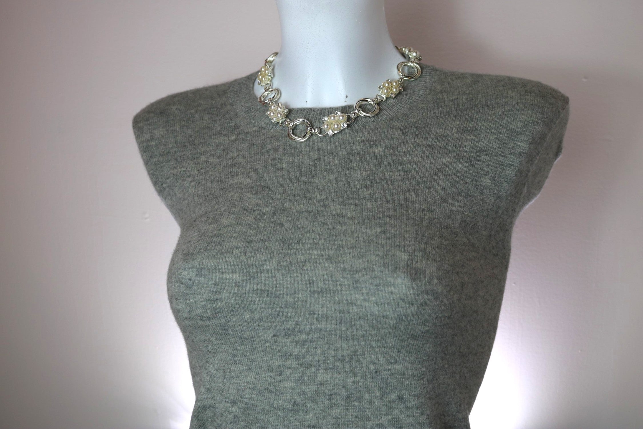 A modern take on a classic design, the Pearl Cluster Necklace features clusters of lustrous faux pearls arranged in a layered, organic design with silver plating.