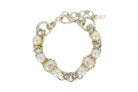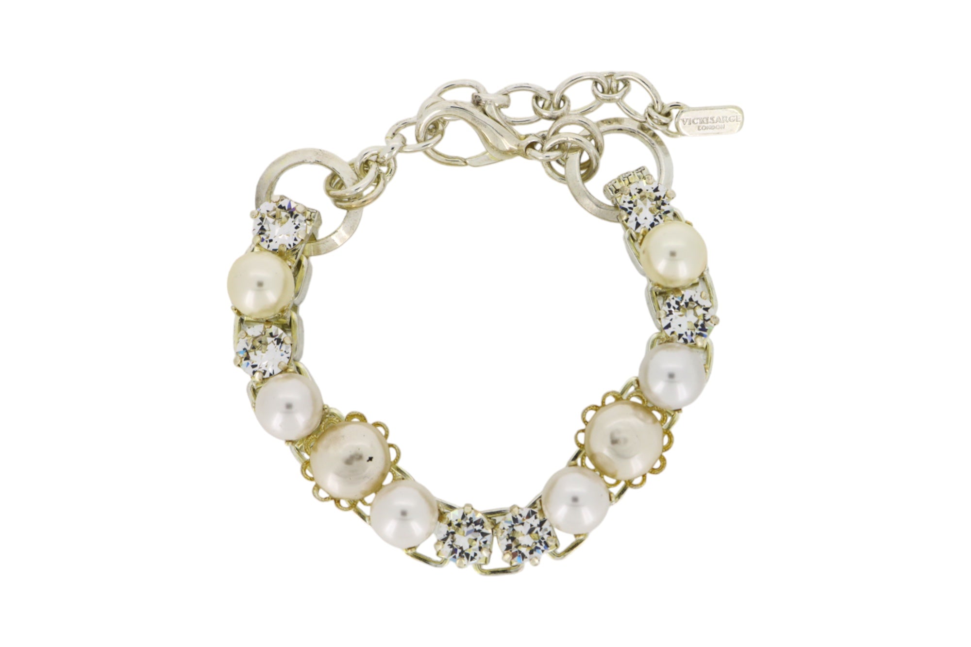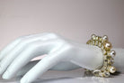 A striking contemporary piece, this bracelet features a sculptural design resembling a ruff collar, finished with silver plating and faux pearls.