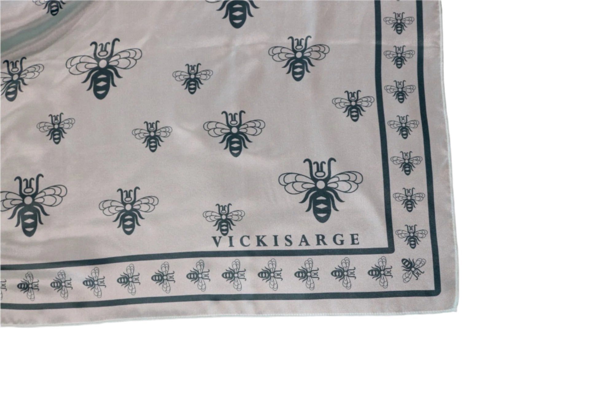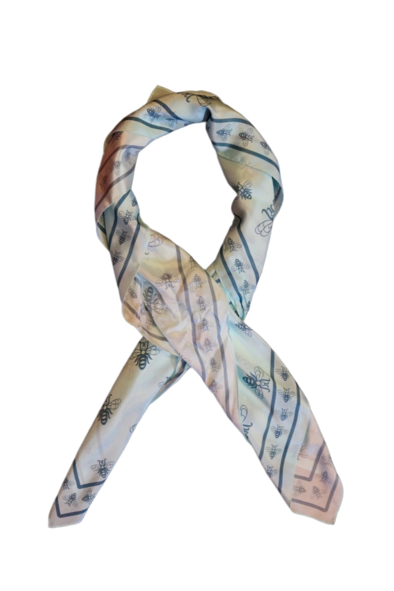 This silk Crepe de Chine scarf is a luxurious accessory, featuring an enchanting pattern of bees delicately printed across its soft, lightweight fabric.