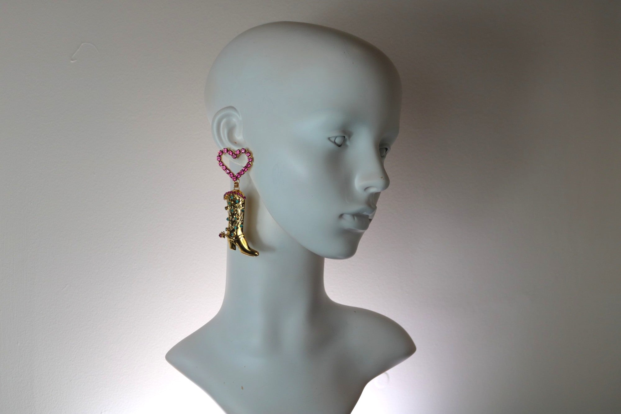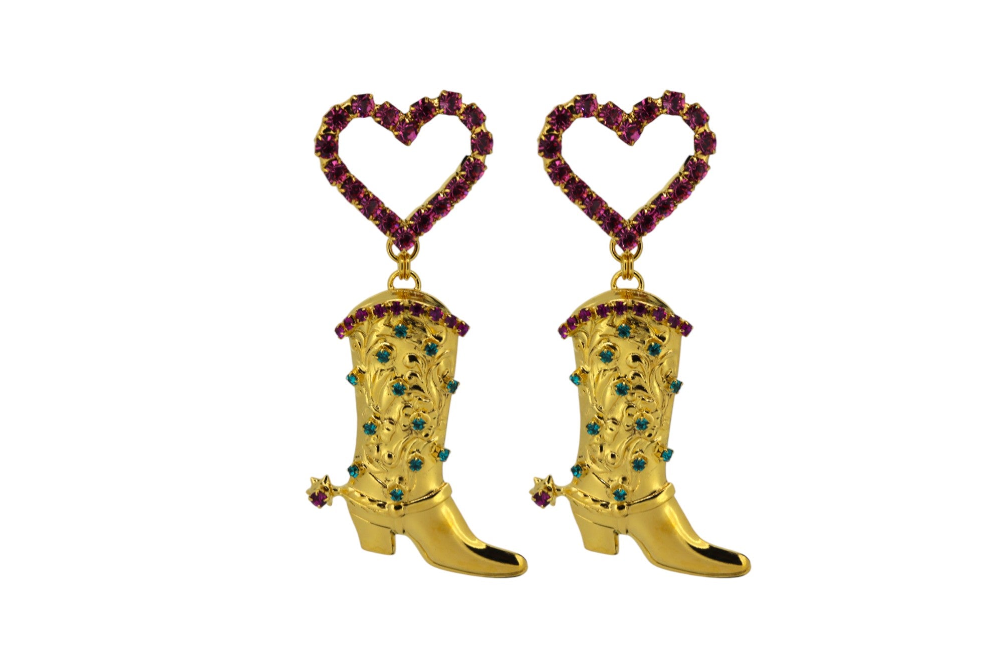 Live out a love story in these pink crystal heart and cowboy boot earrings.