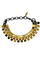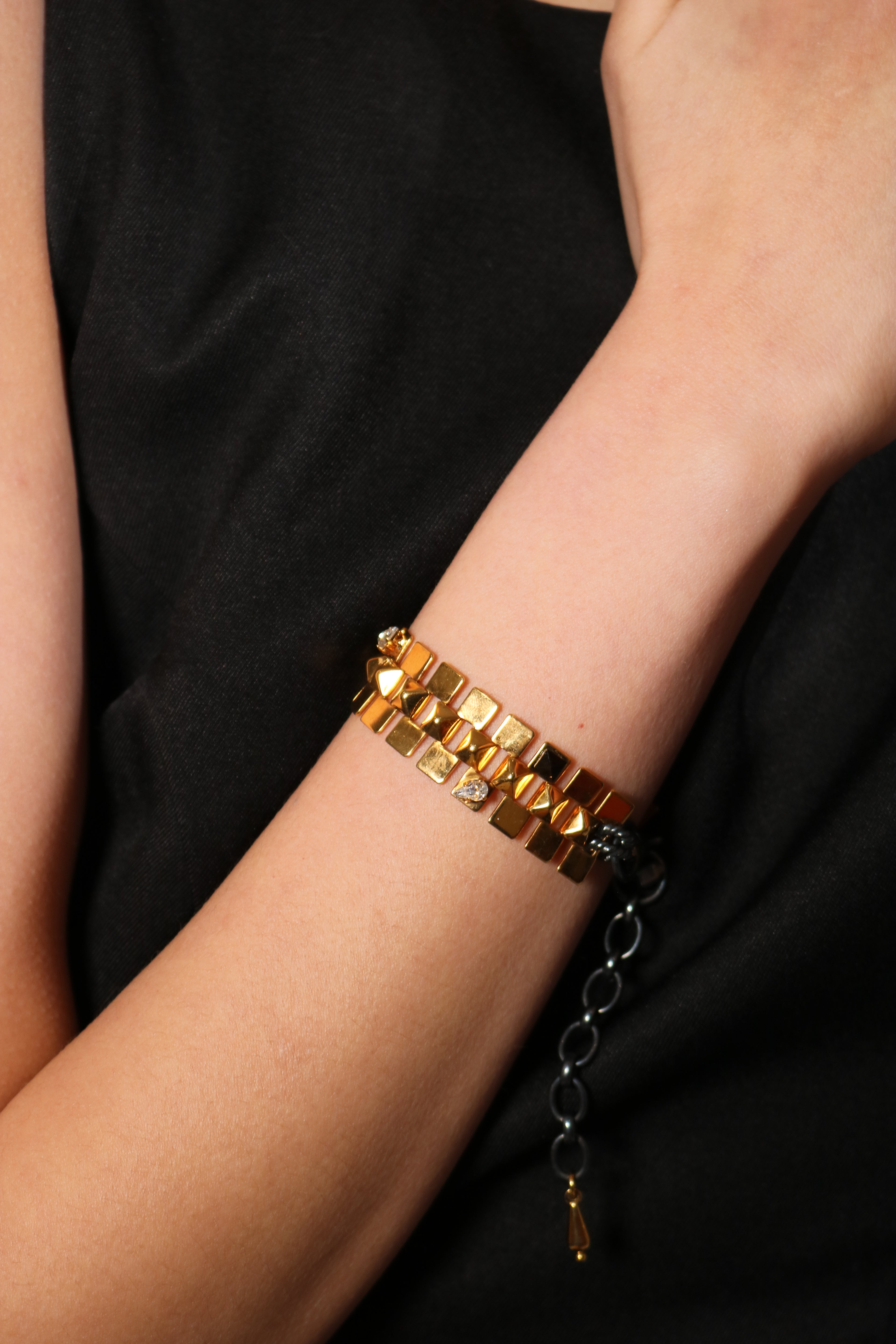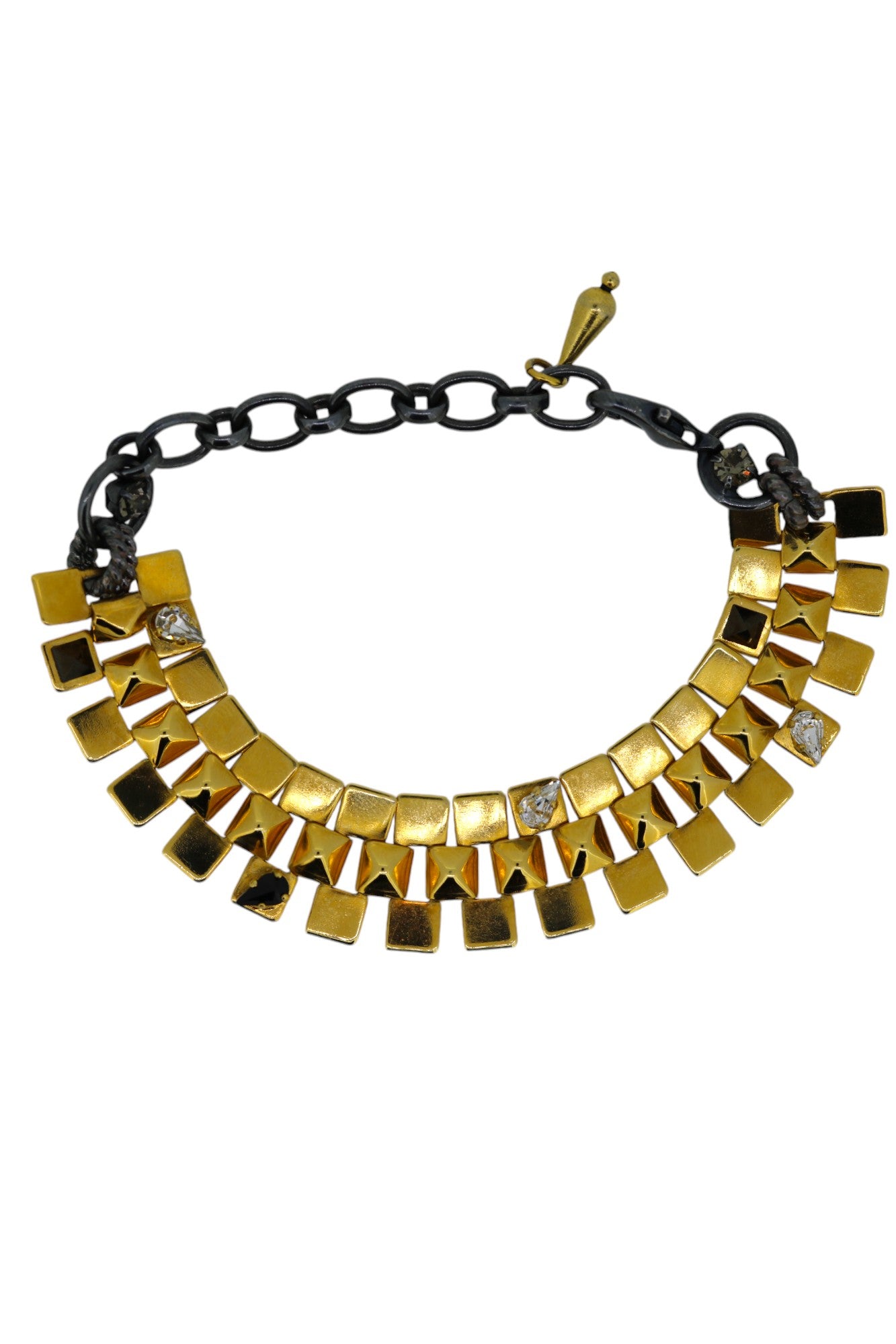 Warm and subtle, this flexible bracelet features minute studs and discreet crystals set on 23k gold plating. Articulated rectangular chain links make this piece a comfortable and lightweight option and an antiqued silver extension chain allows this piece to be adjusted as per your preference.