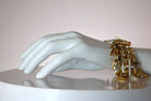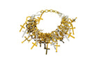 A grand bracelet featuring a cascade of crosses in various sizes and finishes. This necklace features 23k Gold plated chain intricately held together with Sterling Silver plated rings and delicate crystals that catch the light on this piece's multitude of charms.