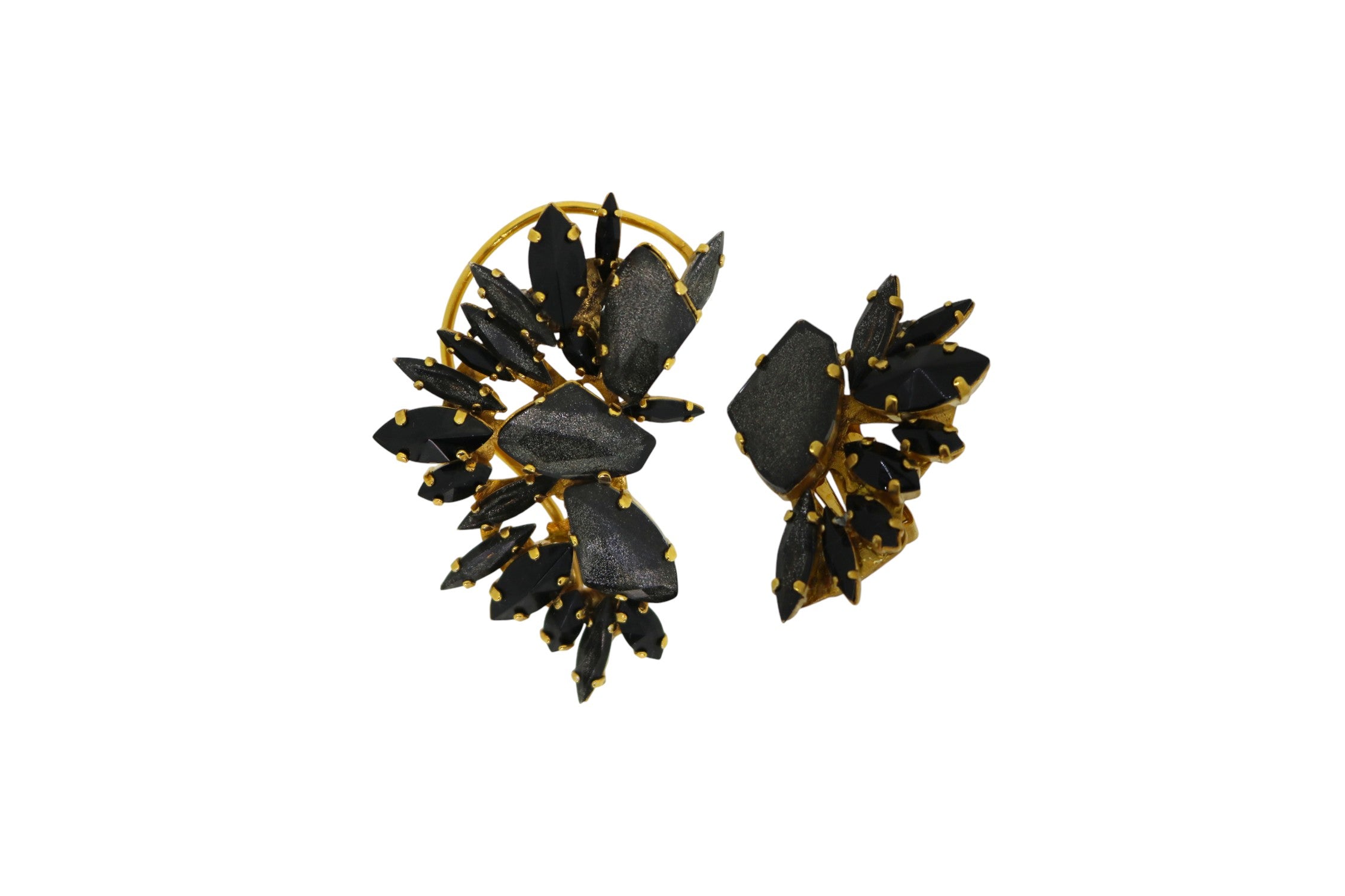Designed in collaboration with Karina Bond, this unique pair fo ear adornments include on ear cuff and one clip earring featuring jagged, dark crystals on 23k Gold plating.