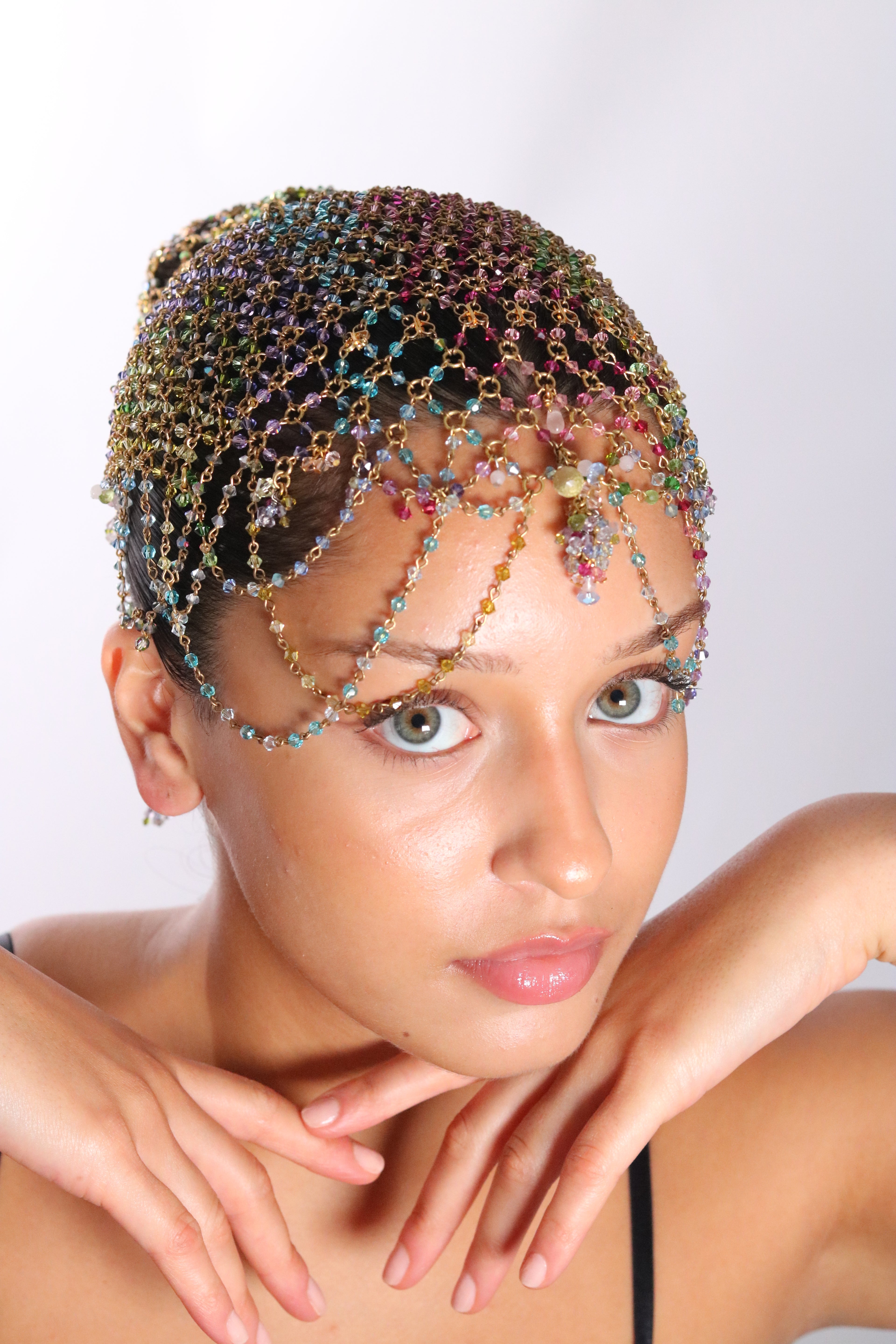 A true labour of love, this hand-beaded headdress is an intricate creation crafted entirely from crystals in a spectrum of multicoloured hues. Taking over forty hours to construct, each bead has been meticulously placed to form a shimmering, almost ethereal tapestry of light and colour.