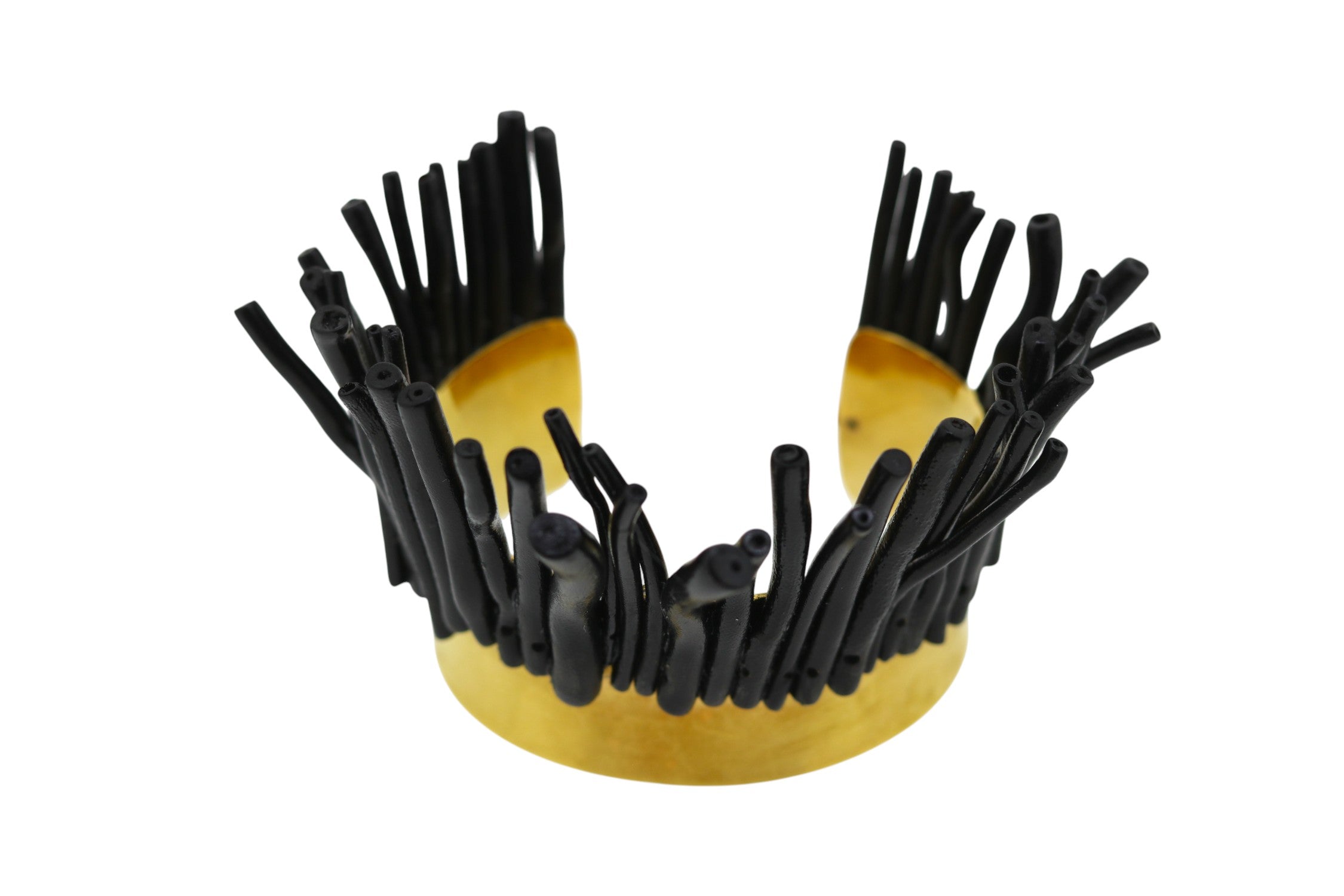 A bold statement cuff edged in an organic row of hand-tinted coral and plated in 23k Gold.