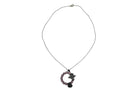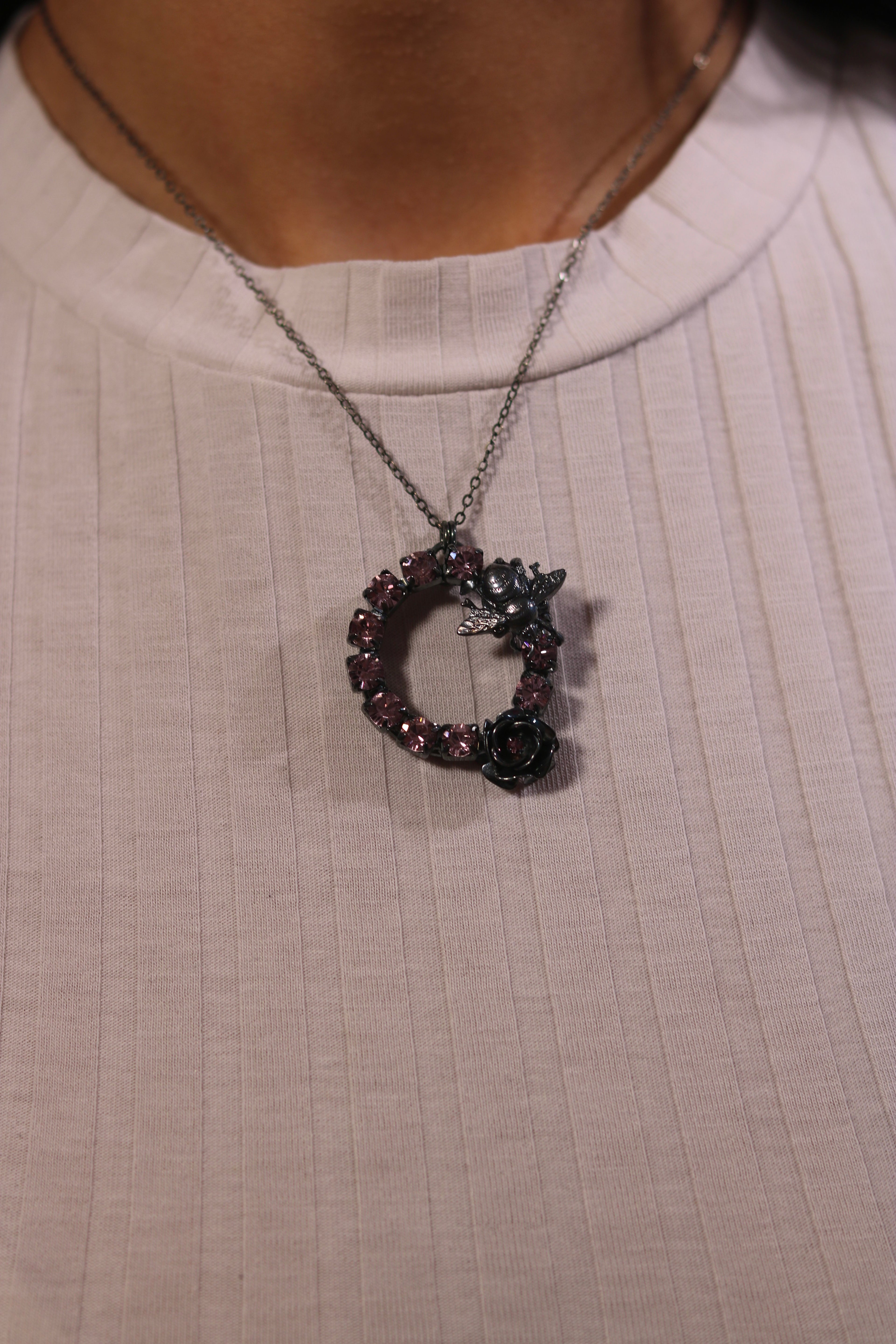 This striking Antiqued Silver-plated hoop pendant necklace features an intricate design with a delicate rose motif and a bug motif, both beautifully adorned with Premium Austrian crystals. The hoop pendant gently frames the motifs, while the crystals add a brilliant sparkle, bringing the floral and insect details to life.