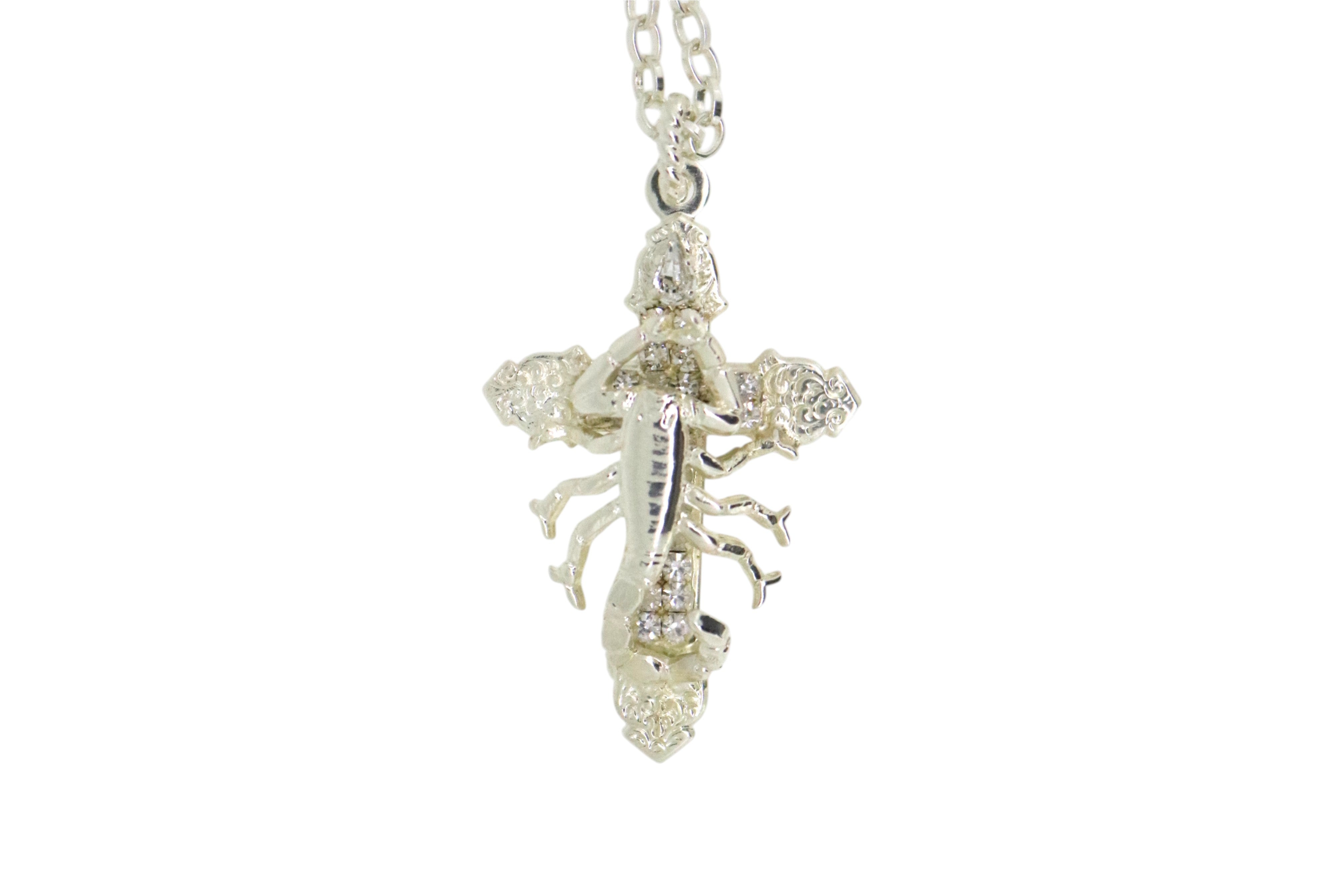 Delicate Sterling Silver plated chain and cross pendant with crawling scorpion motif and dripping chain.