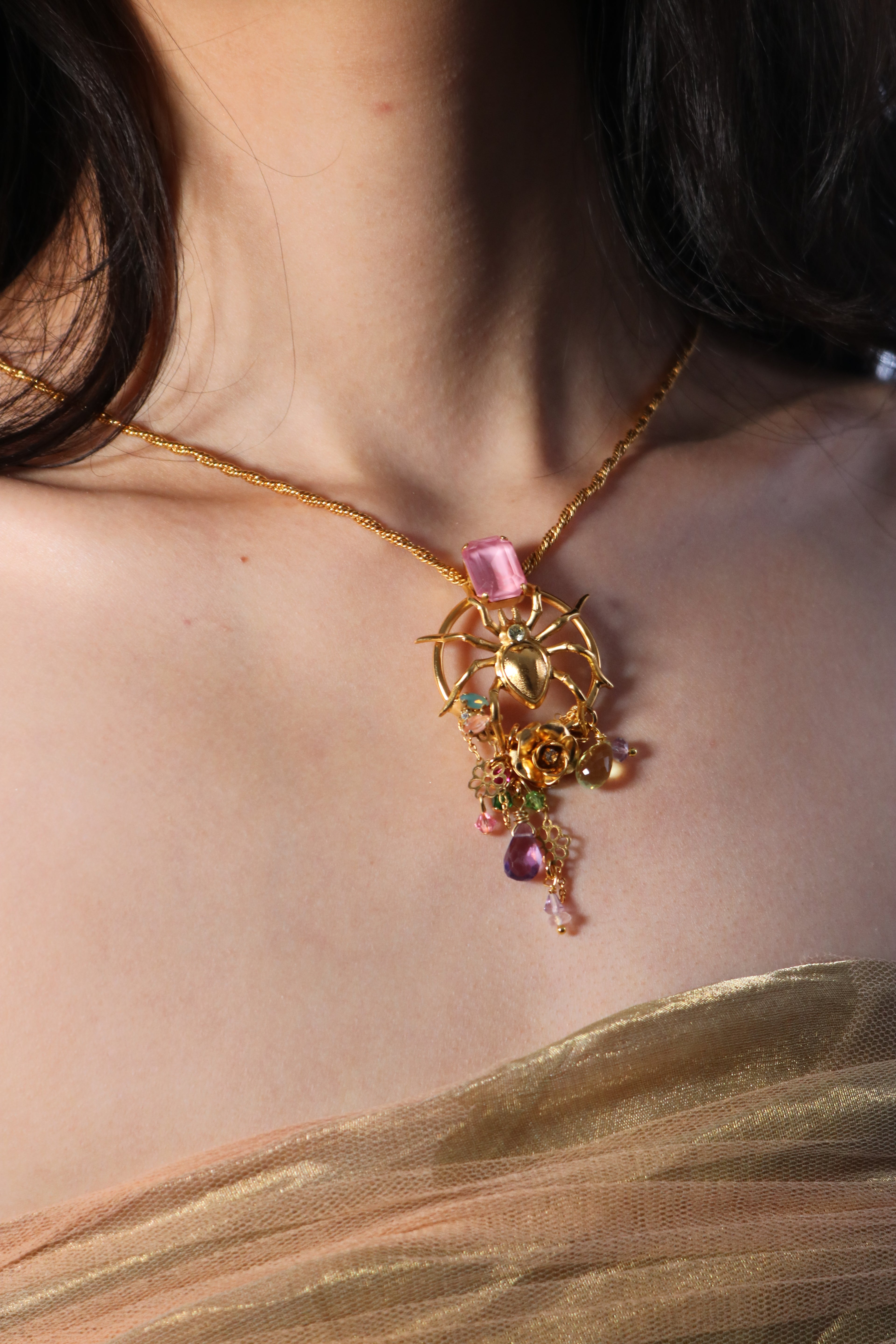 This enchanting long necklace showcases a mesmerising 23k Gold plated spider pendant, delicately poised around a hand-tinted crystal that shimmers with unique depth and colour. Suspended beneath, dangling semi-precious droplets add graceful movement, evoking the beauty of dewdrops glistening on a web.