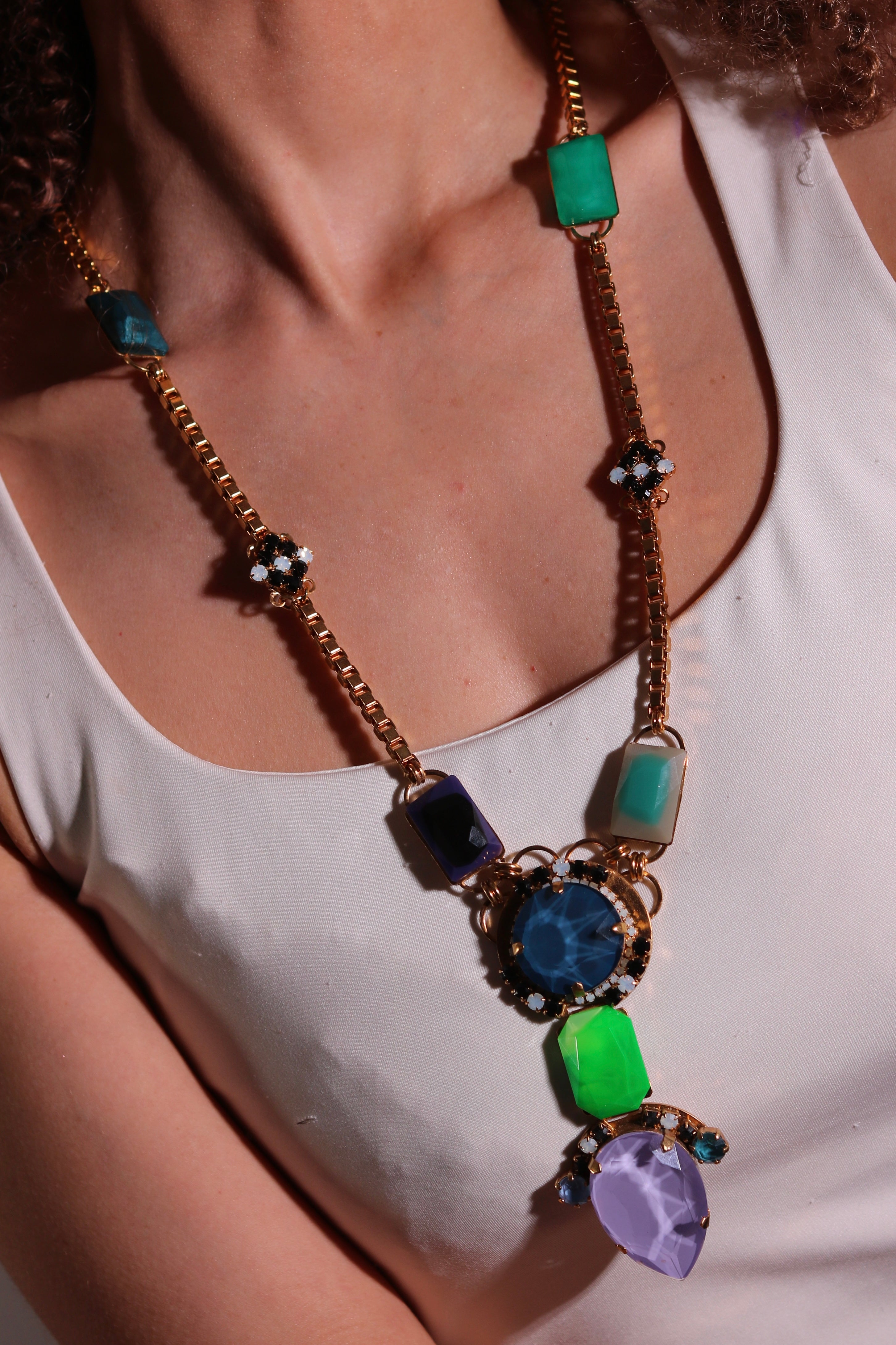 This necklace features a striking arrow motif crafted from vintage Acrylic stones and Premium Austrian crystals, beautifully finished with hand-finished shades of lavender and lime for a vibrant, one-of-a-kind statement piece