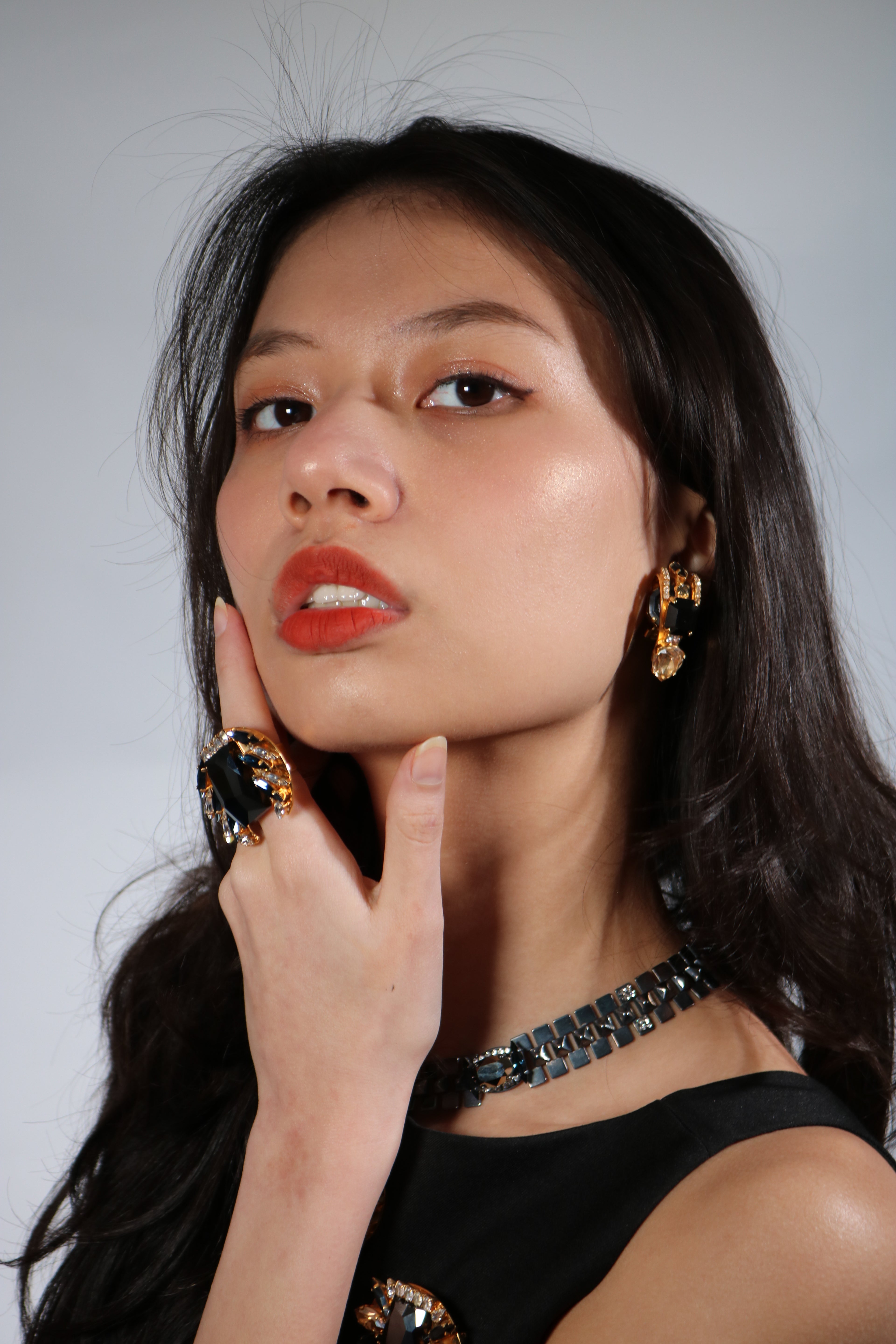A flame-like ring with a forked motif, this cocktail ring is finished in 23k gold and features marquise-cut crystals radiating from a large black Swarovski stone.