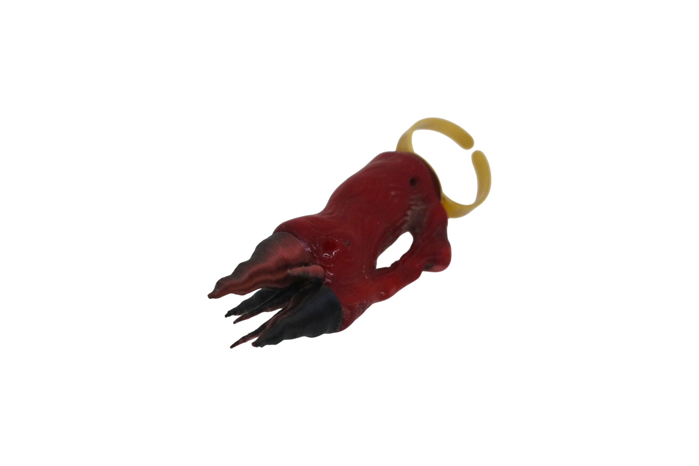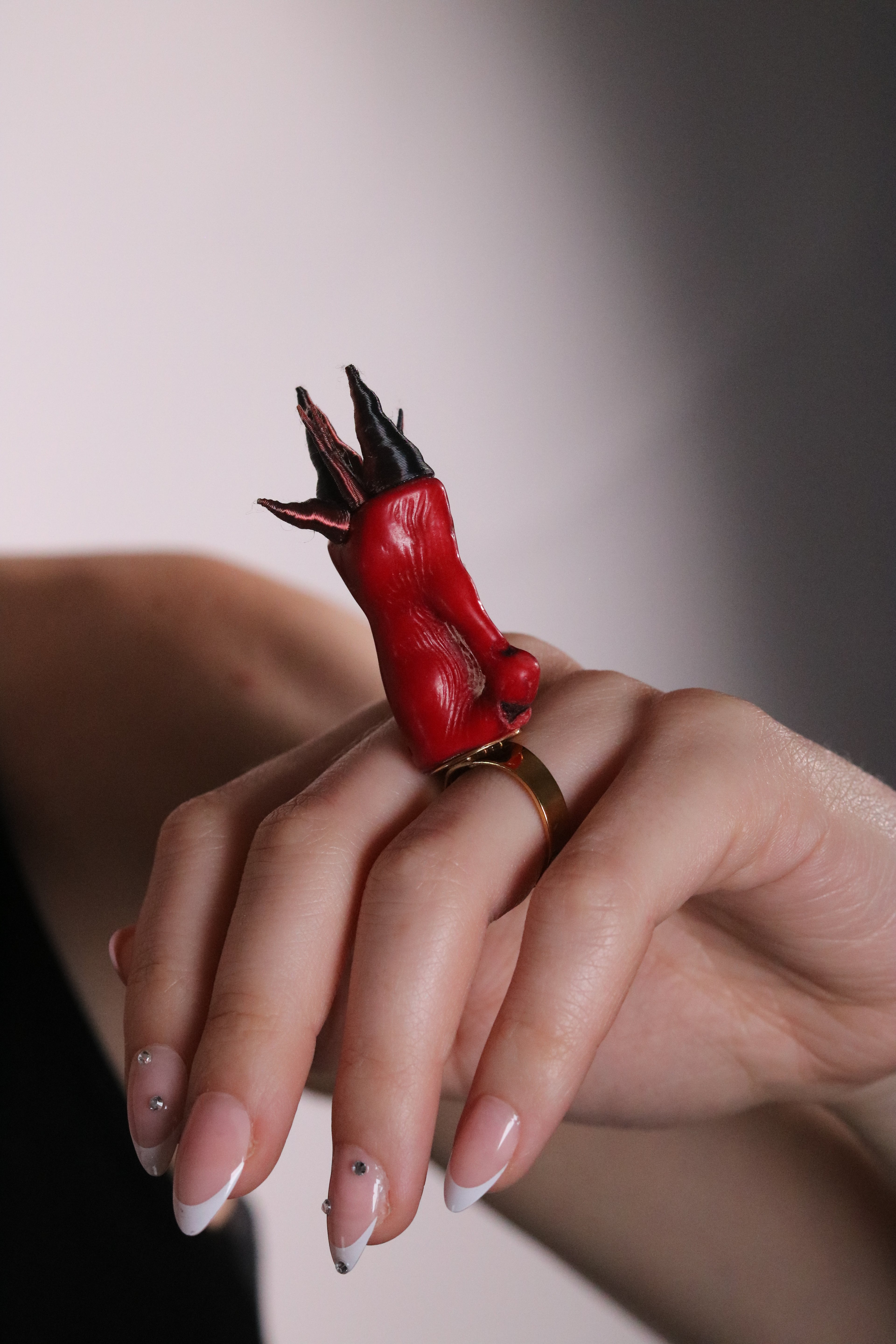 Designed in collaboration with Karina Bond, this one-of-a-kind cocktail ring features a spire of natural red coral and 3d printed spikes on an adjustable band finished in 23k Gold.