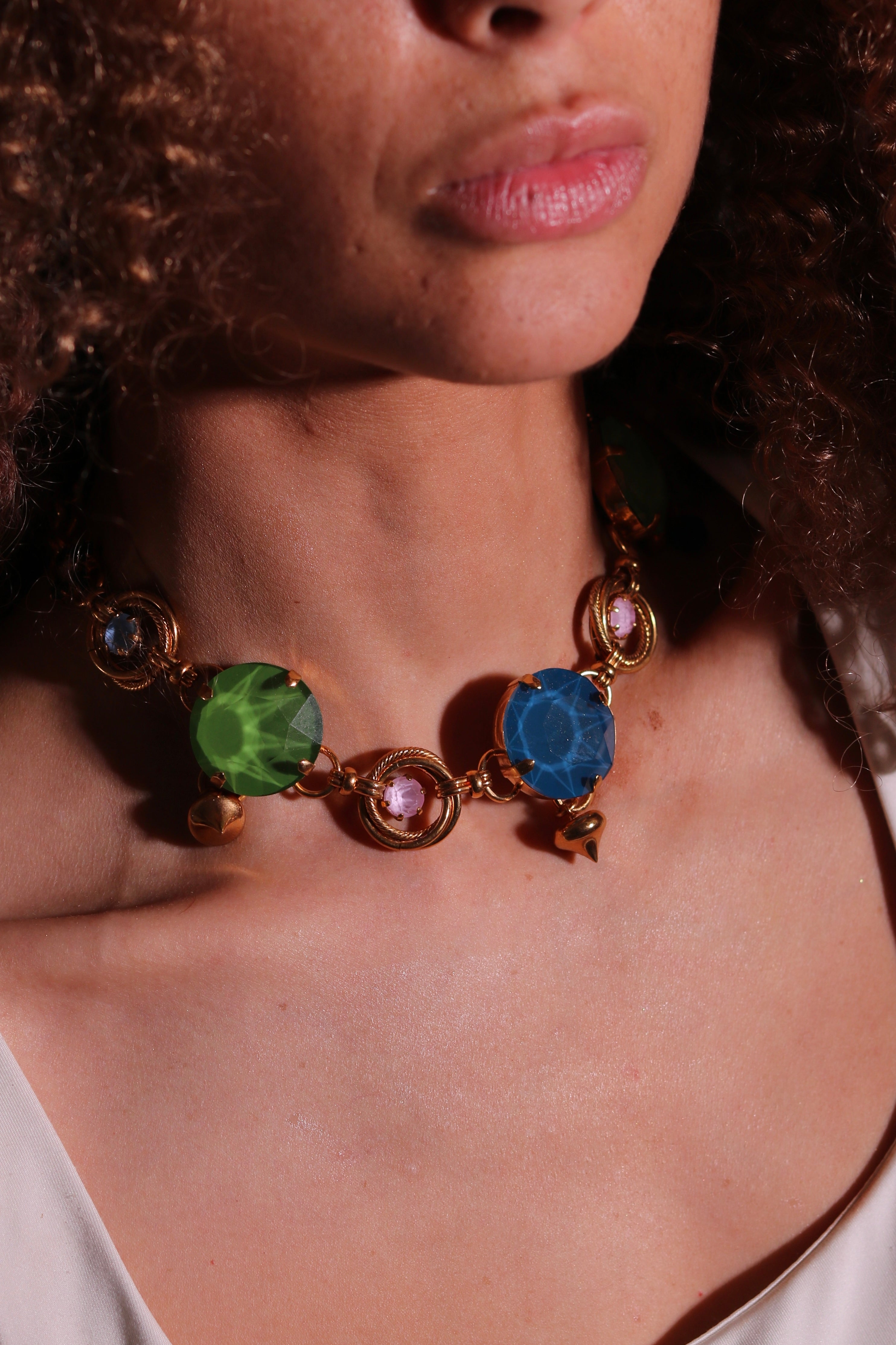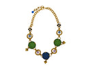 This necklace showcases hand-finished crystals in shades of green and blue alongside tactile gold droplets. Finished in 23k Gold plating, this standout piece is perfect for adding a touch of bold elegance to any look.