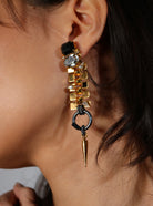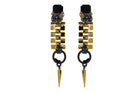 These dangling statement earrings feature minute studs and discreet crystals set on 23k Gold Plating. Articulated rectangular chain links hang beneath a pair of Premium Austrian Crystals in a monochrome palette and terminate in a gold spikes.