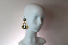 Impactful chandelier earrings featuring a forked flame motif finished in 23k gold. Premium Austrian Crystals in contrasting tones of black, blue and grey catch the light as these articulated earrings move.