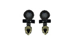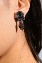 Black and inky grey stone set above. These earrings are set in blackened Sterling-Silver plating and feature two discreet chain links.
