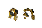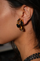 A feat of construction, these unusual earrings feature brushstroke curves that hide and reveal hidden crystals. Finished in bright 23k gold and accented with Swarovski crystals in shades of grey and amber.