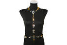 A signature VICKISARGE bodypiece featuring a pointed collar in antiqued sterling-silver plating and a central chain and belt comprising of some of our largest Crystals! This bodypiece combines crystals in shades of grey, black and clear accented with 23k gold links and dripping stud pieces.