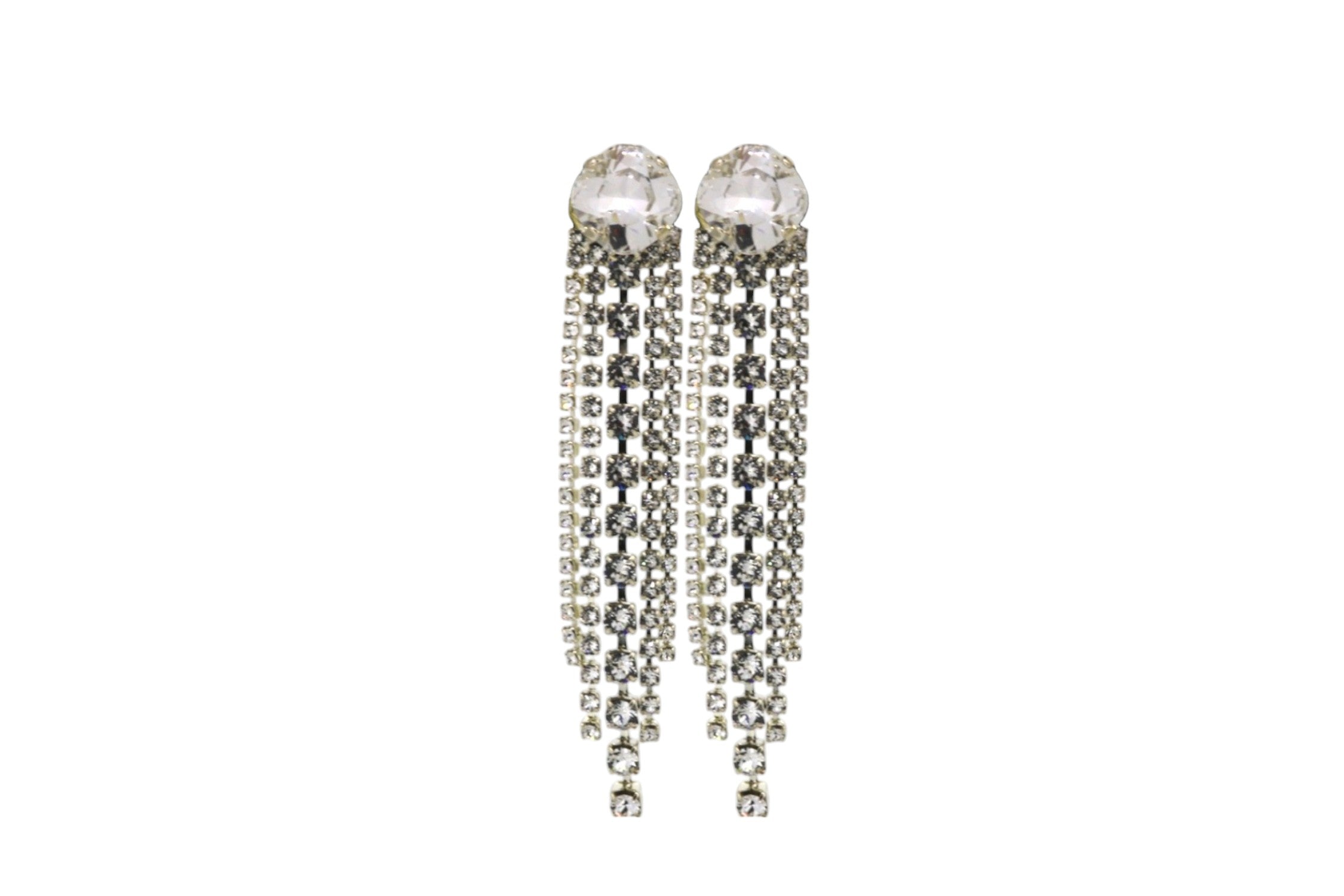 Featuring dazzling cushion-cut Premium Austrian Crystals dripping with shimmering tails and Platinum plating, these earrings are handcrafted in our Kensington workshop.