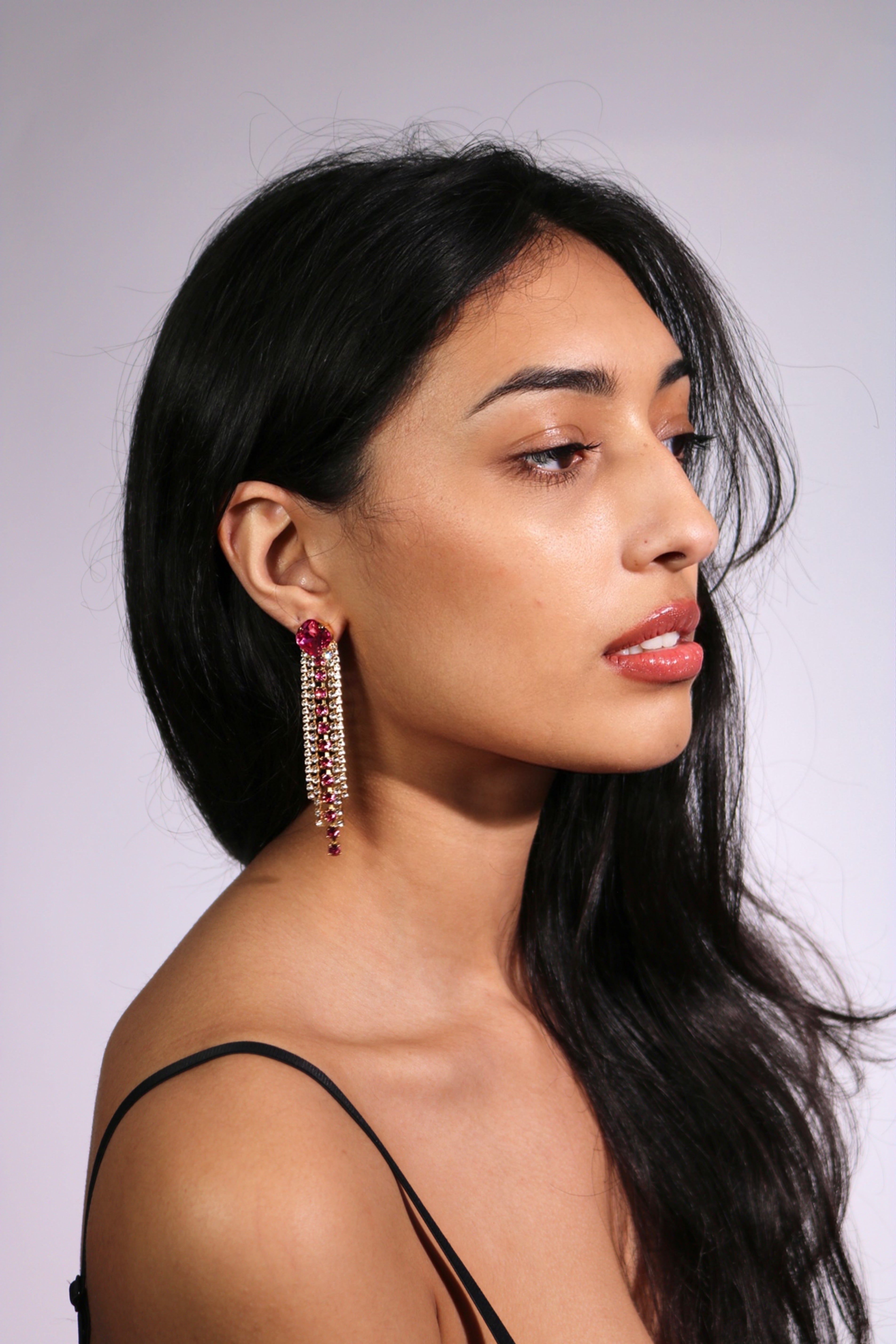 Featuring dazzling cushion-cut Premium Austrian Crystals dripping with shimmering tails and 23k Gold plating, these earrings are handcrafted in our Kensington workshop.