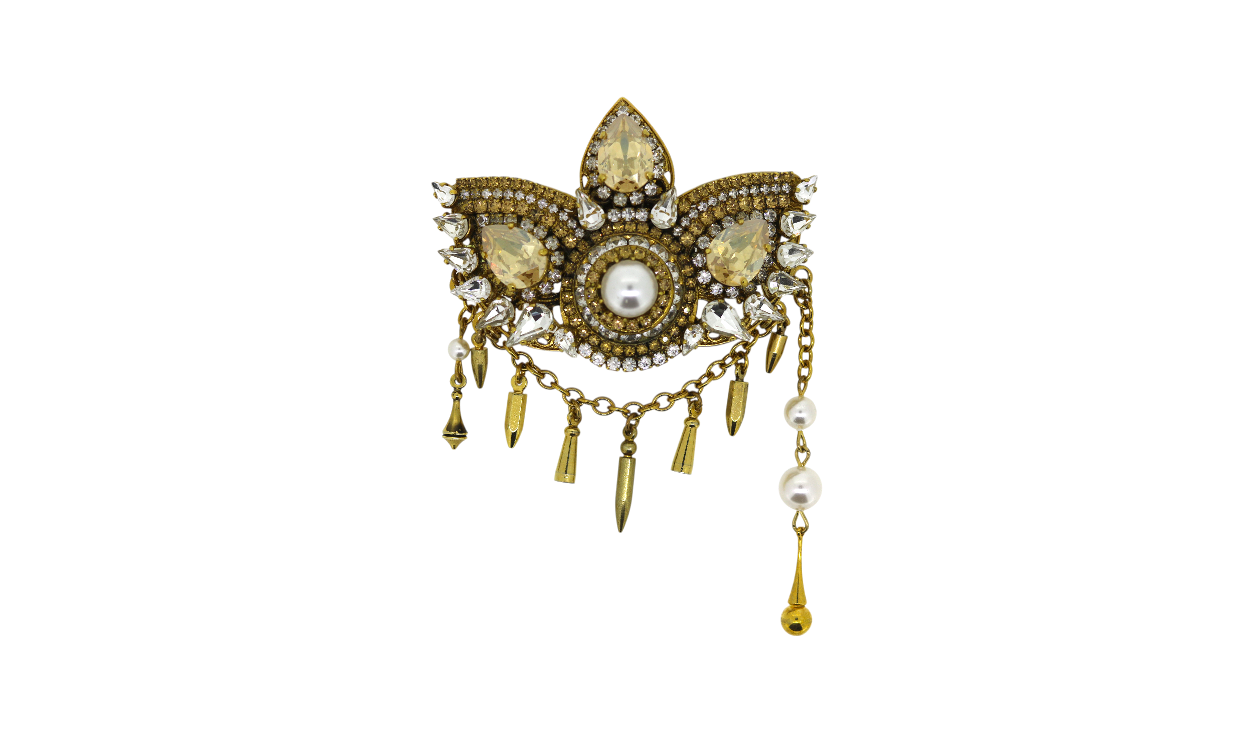 This luxury costume brooch features a striking central pearl surrounded by teardrop crystals, intricate gold detailing, and elegant dangling charms, radiating regal sophistication and timeless glamour.