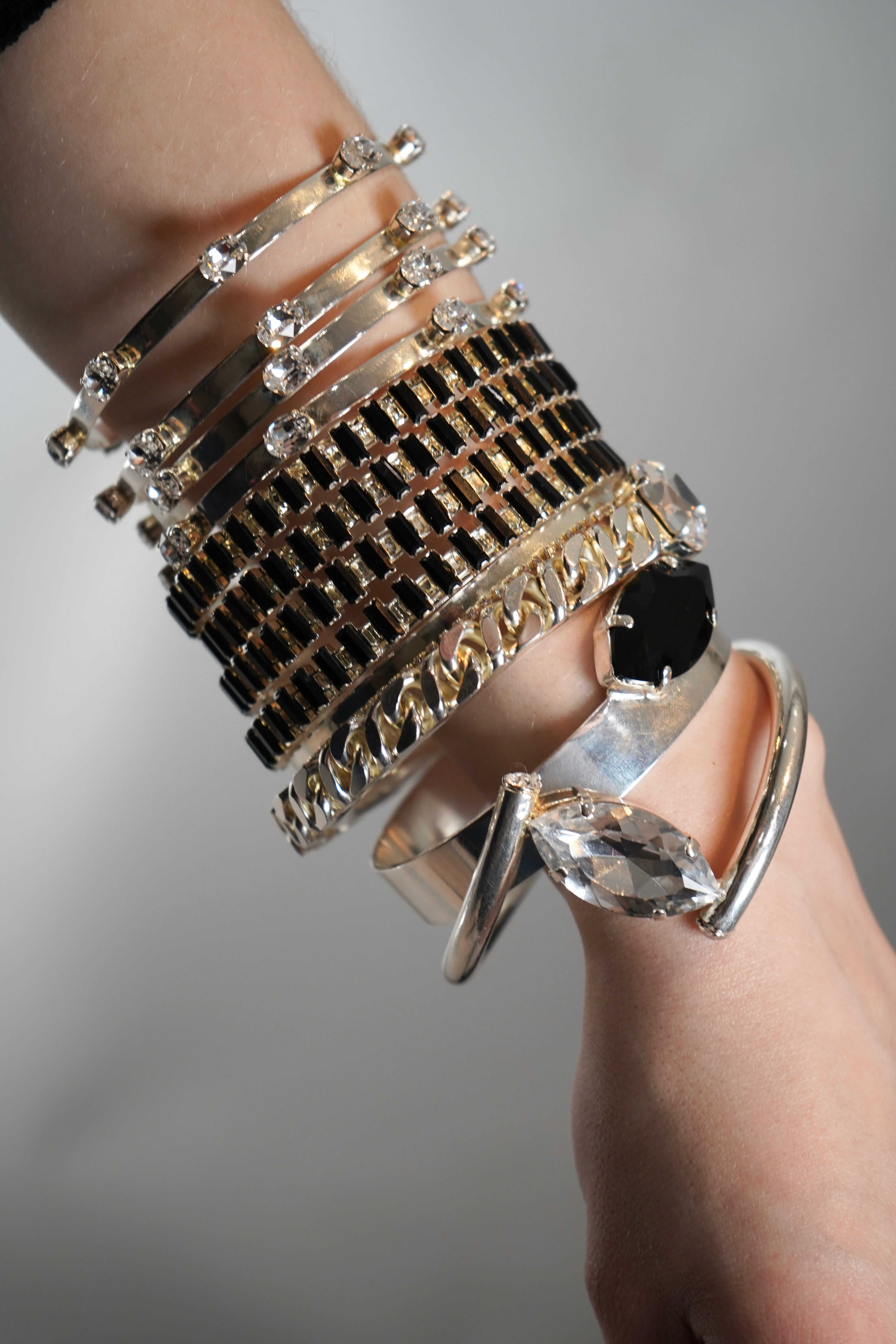This sleek silver bracelet features a striking oversized premium Austrian crystal centrepiece, offering a modern statement of minimalist luxury and refined glamour.
