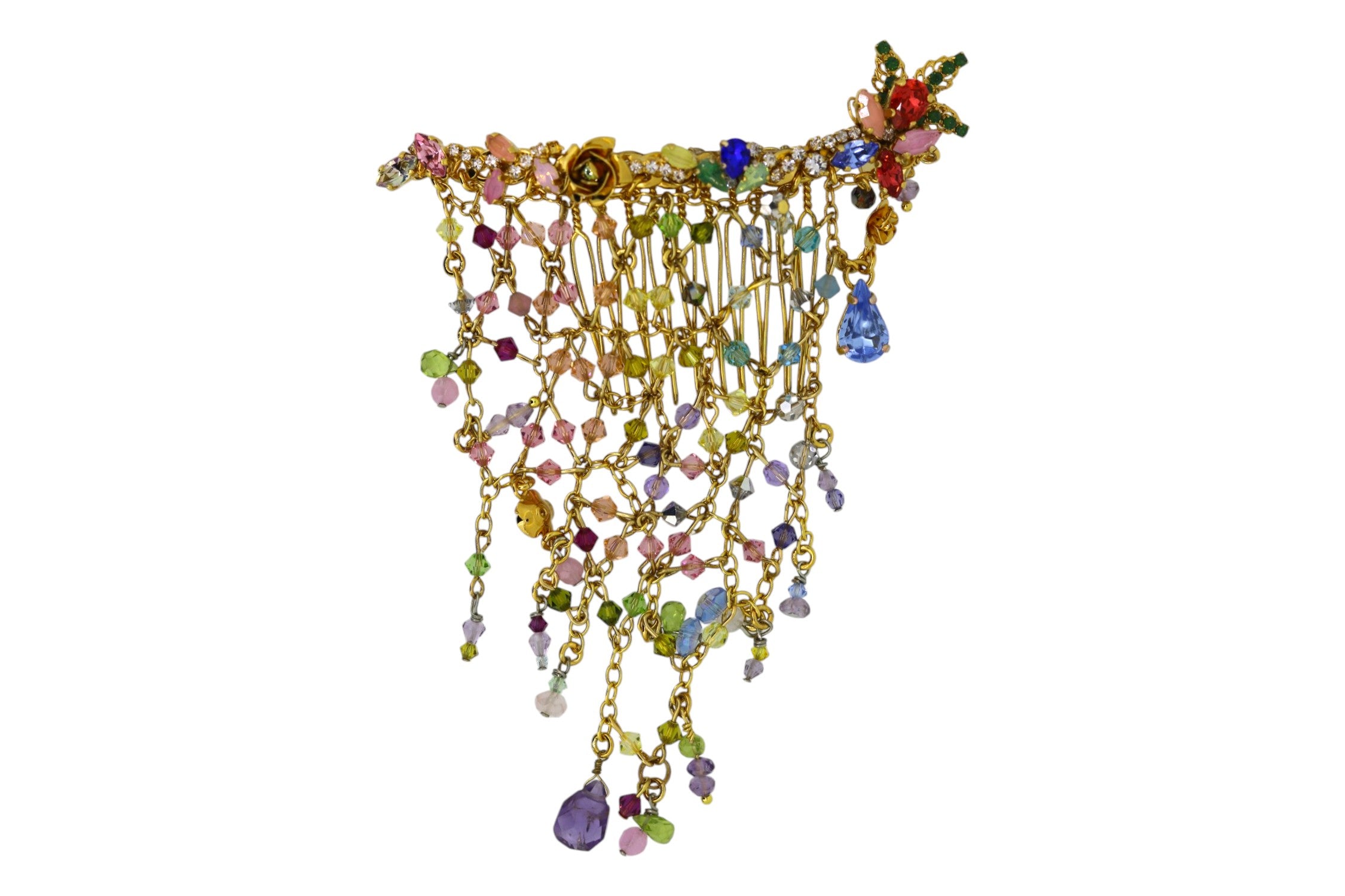 This exquisite 23k Gold-plated comb is elegantly crafted in the form of a branch of blossoms, capturing the delicate beauty of nature in full bloom. Dangling from the golden branches is a trellis of technicolour crystals and semi-precious stones, shimmering with every movement like dewdrops catching the light. A true statement of craftsmanship, this comb is both an ornament and a piece of wearable art, perfect for those who seek elegance with a touch of the extraordinary.