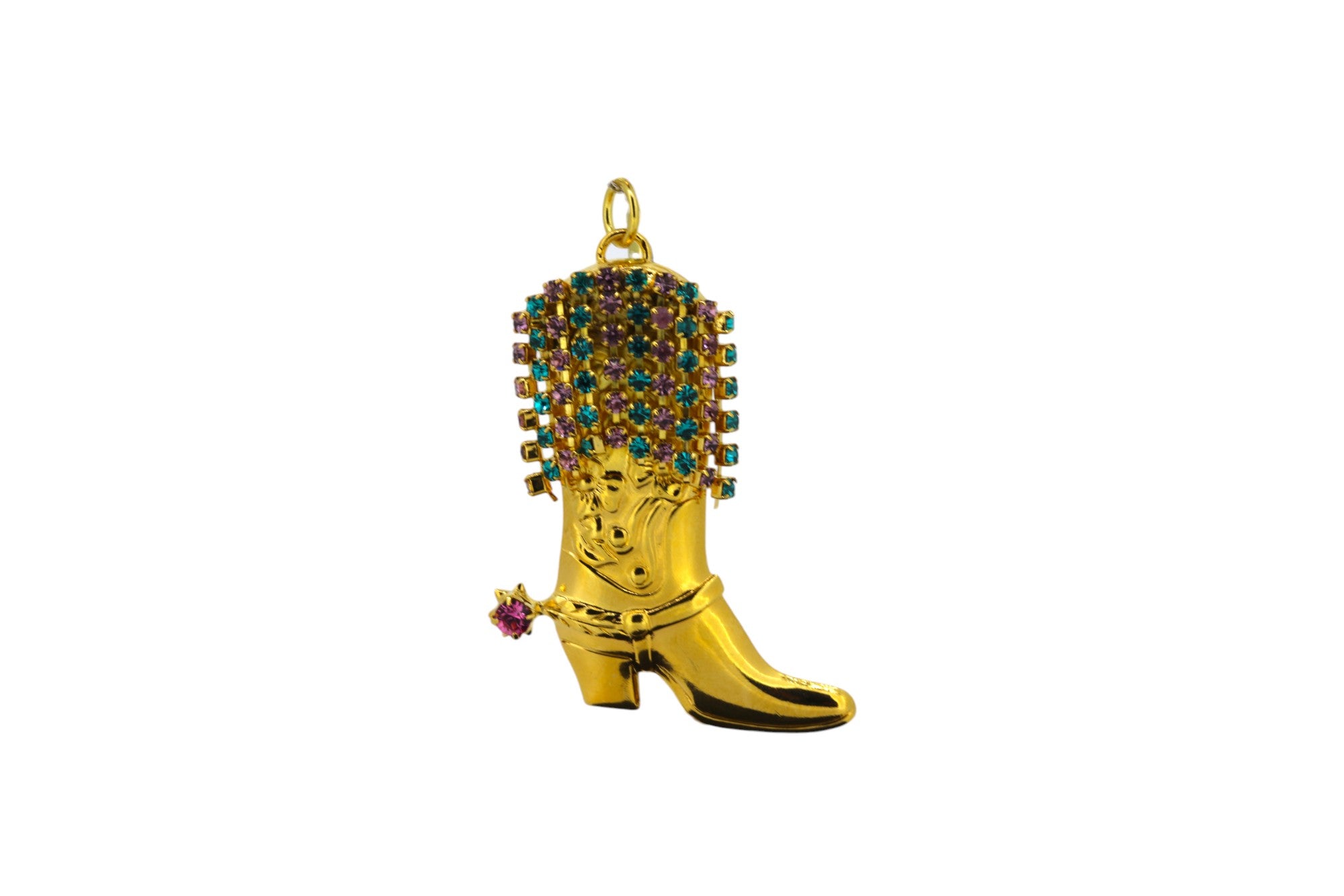 Plated in 23k Gold, our fringed cowboy boot charm is set with deep green crystals. The perfect touch of sparkle to add to a necklace, or even your very own VICKISARGE charm bracelet.
