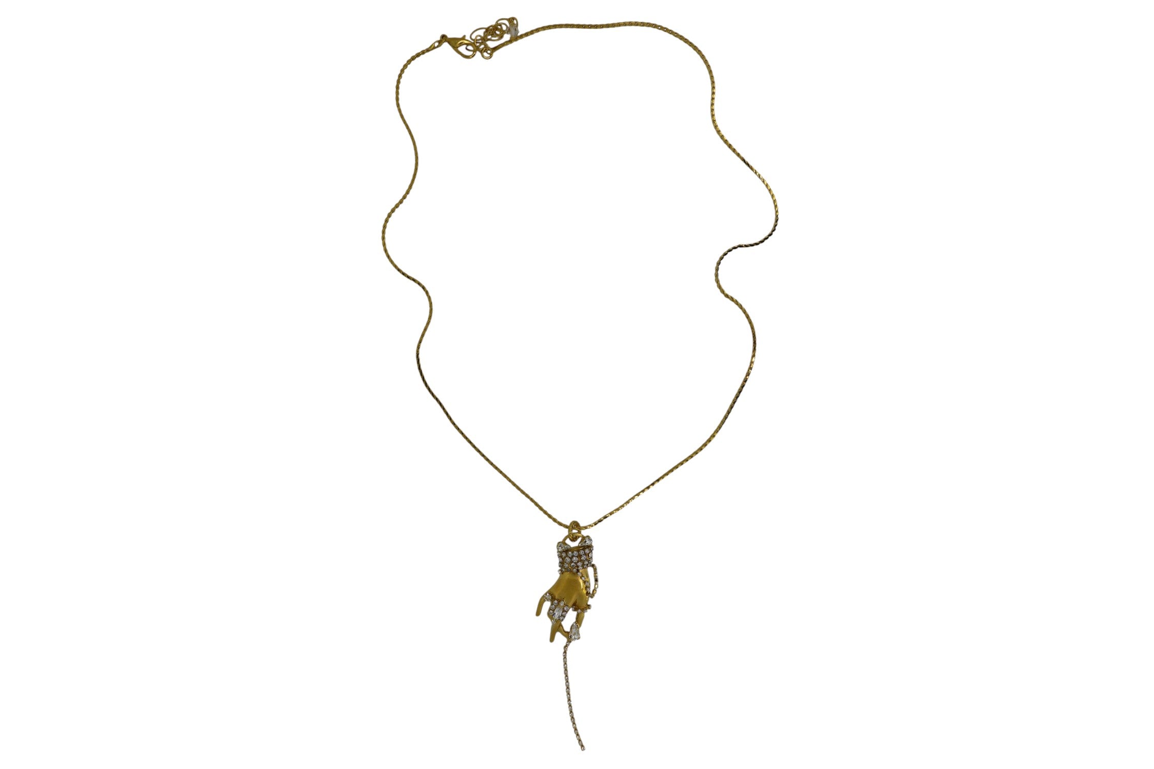 A glowing hand pendant decorated in premium Austrian crystals and finished in 23k Gold plate is suspended from a fine chain.
