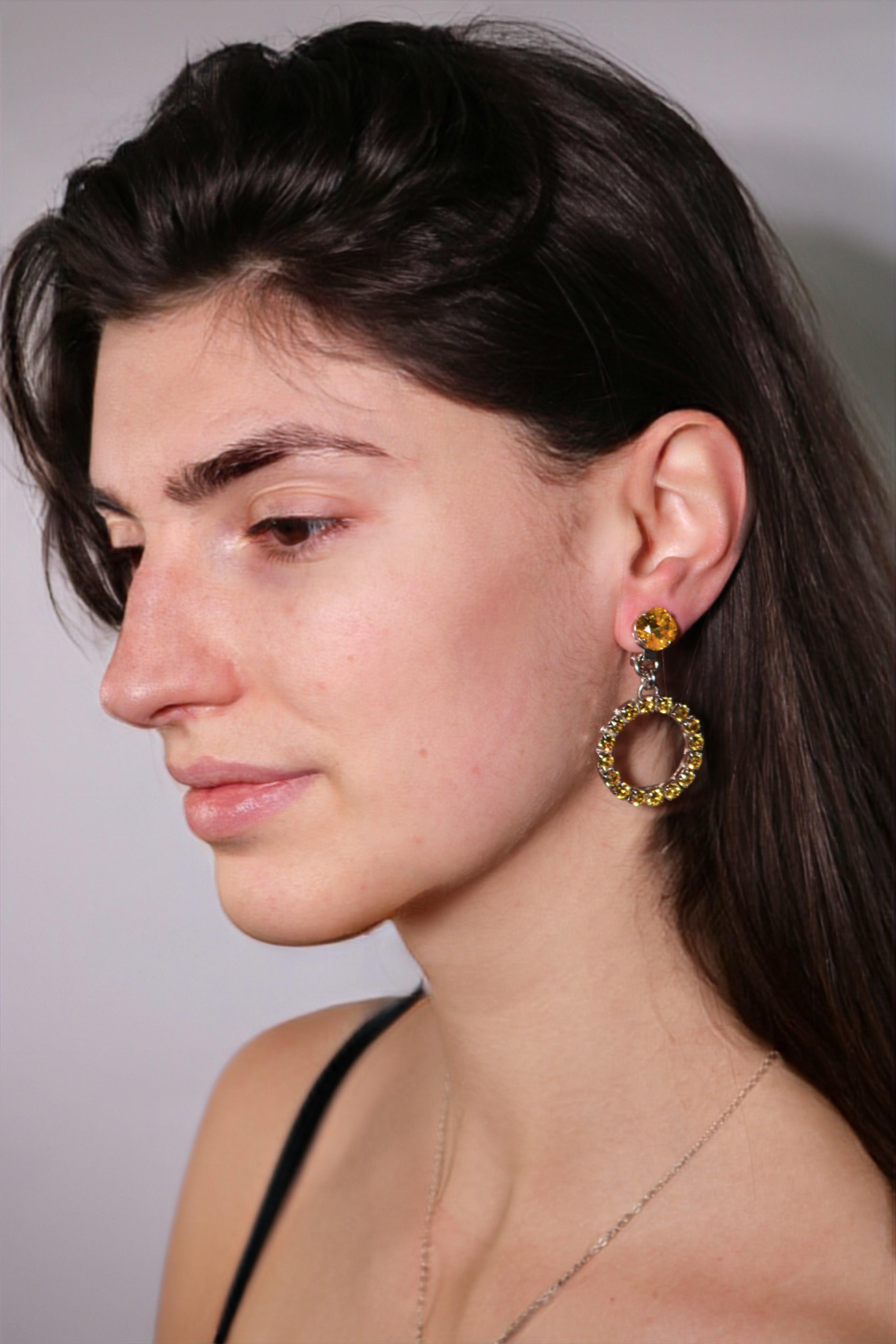 Estos aros, engastados con 16 cristales austriacos de primera calidad en un lujoso baño de platino, están hechos a mano en nuestro taller de Kensington. Ideales para esos momentos que requieren un poco de dramatismo adicional, estos aretes seguramente llamarán la atención. A pesar de los cristales, estos aretes son livianos y cómodos para un uso prolongado.
