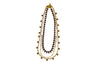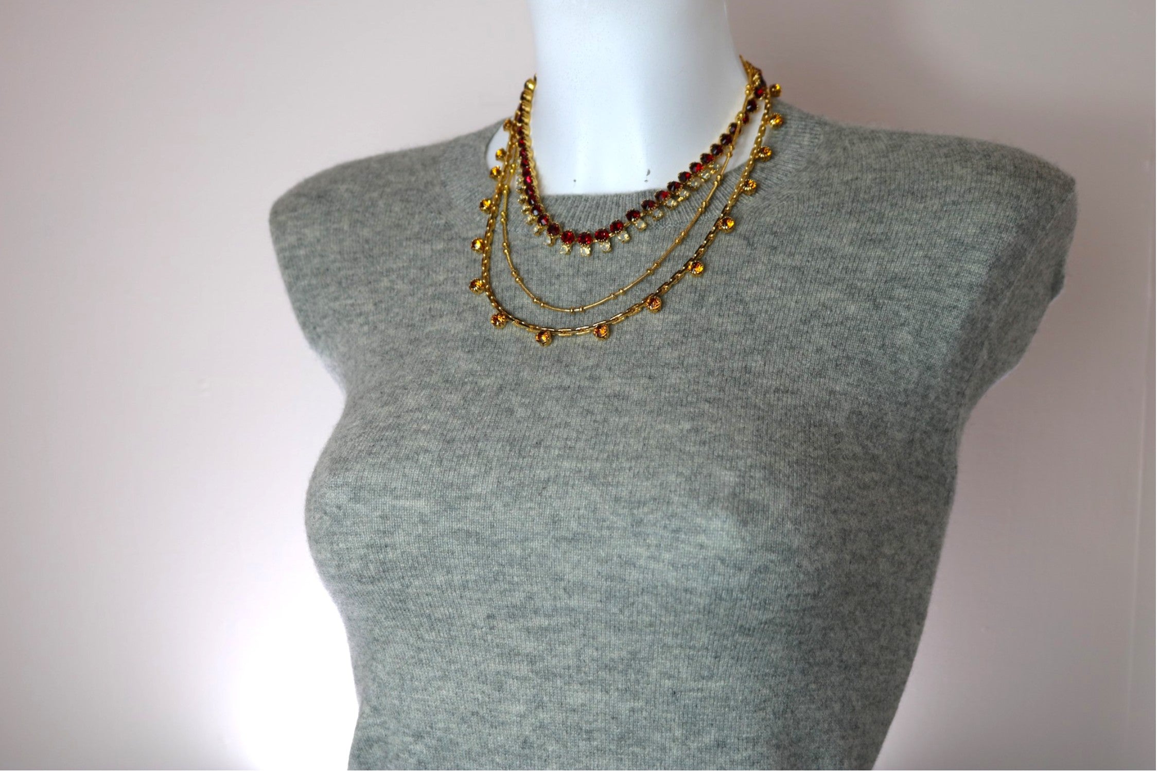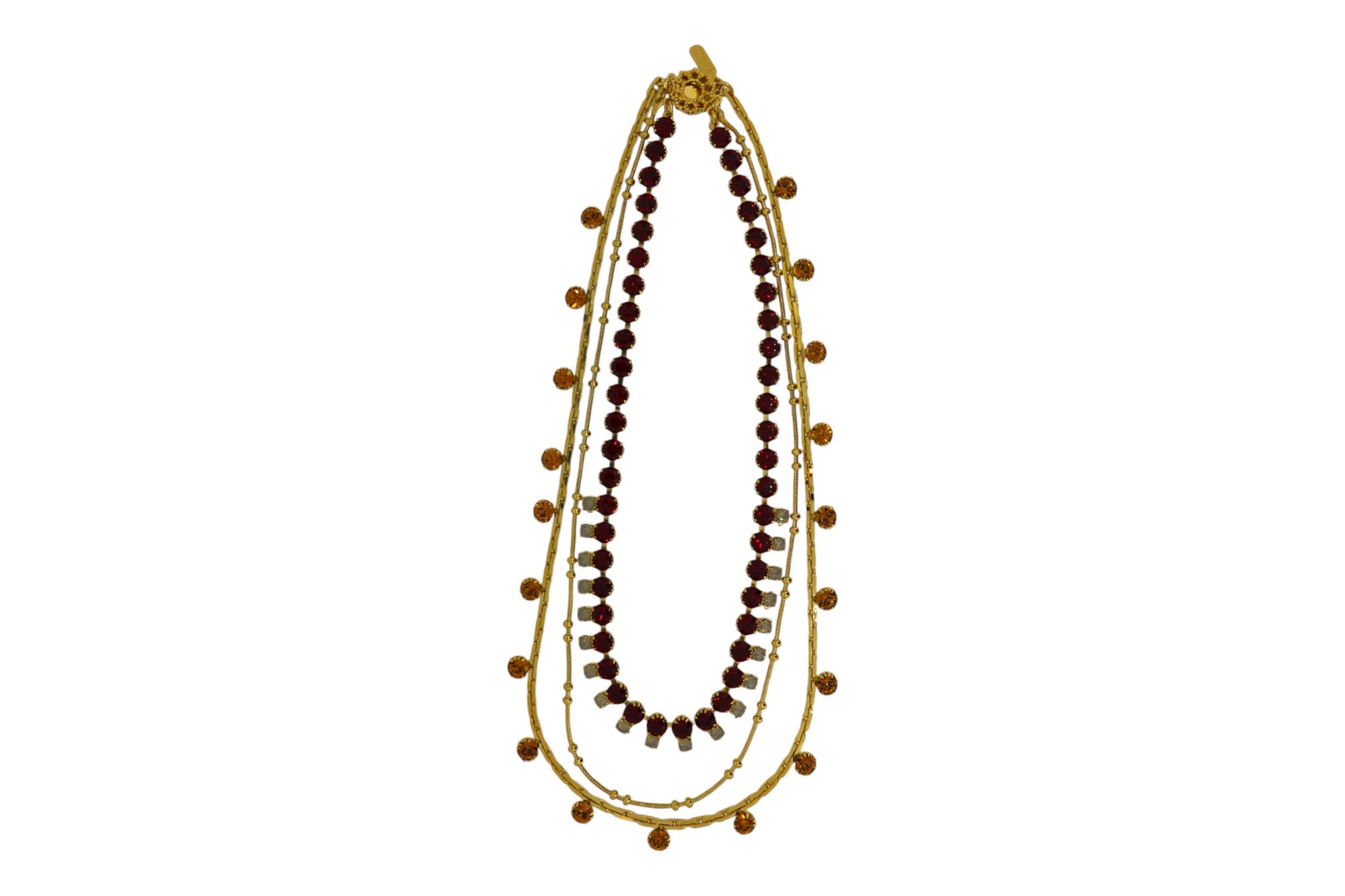 Un delicado collar de tres capas con cadenas doradas entremezcladas con cristales en tonos otoñales. El juego de cadenas brillantes y cristales vibrantes captura la esencia del otoño, ofreciendo un look refinado y en capas.