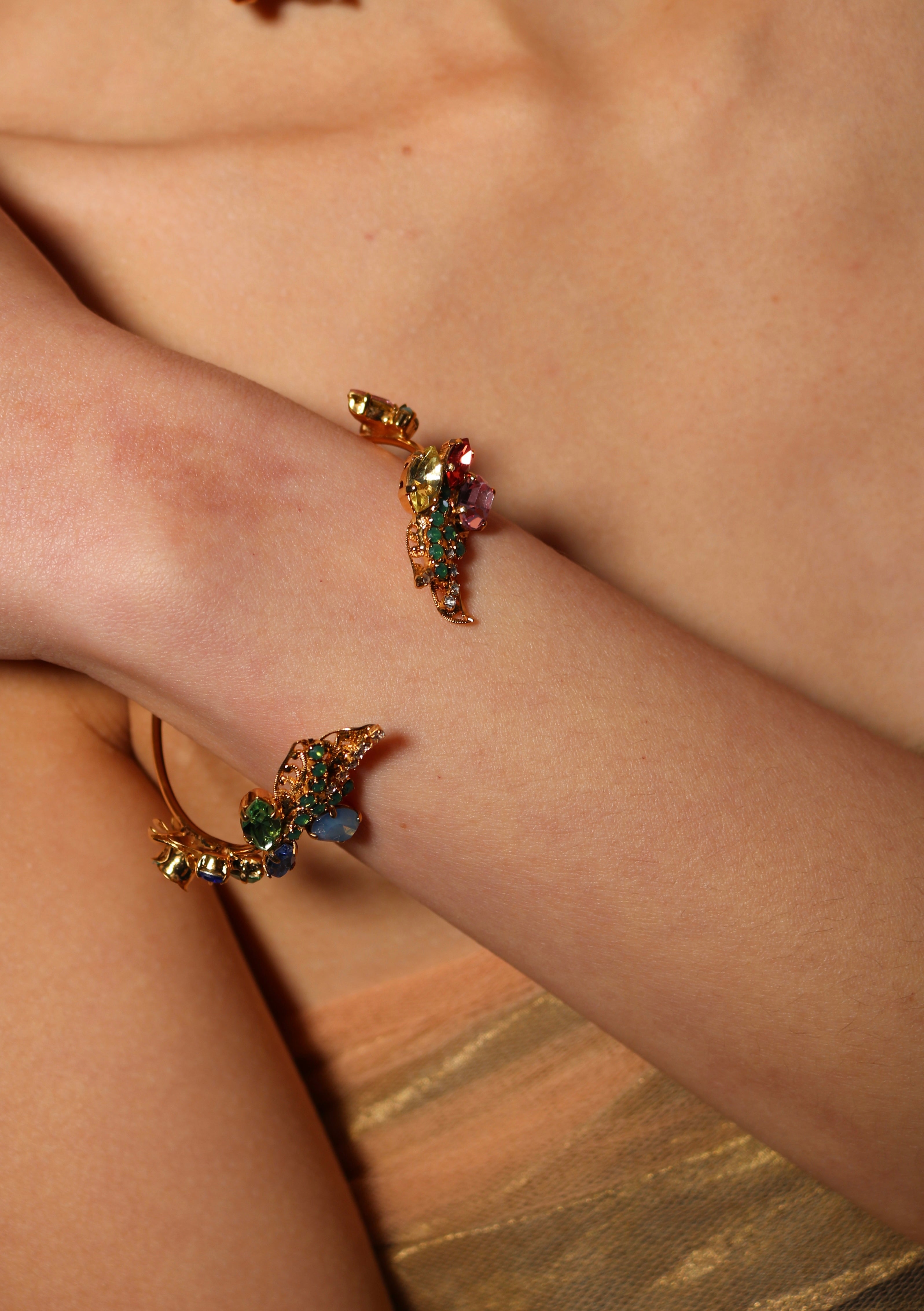 Sculpted with exquisite detail, this torque bracelet's open-ended structure is adorned with multicoloured floral blooms. Each delicately crafted blossom appears as if it is gently caressing the skin. The vibrant hues of the Premium Austrian Crystal contrast beautifully against the warm 23k Gold gold, creating a mesmerising interplay of colour and light.