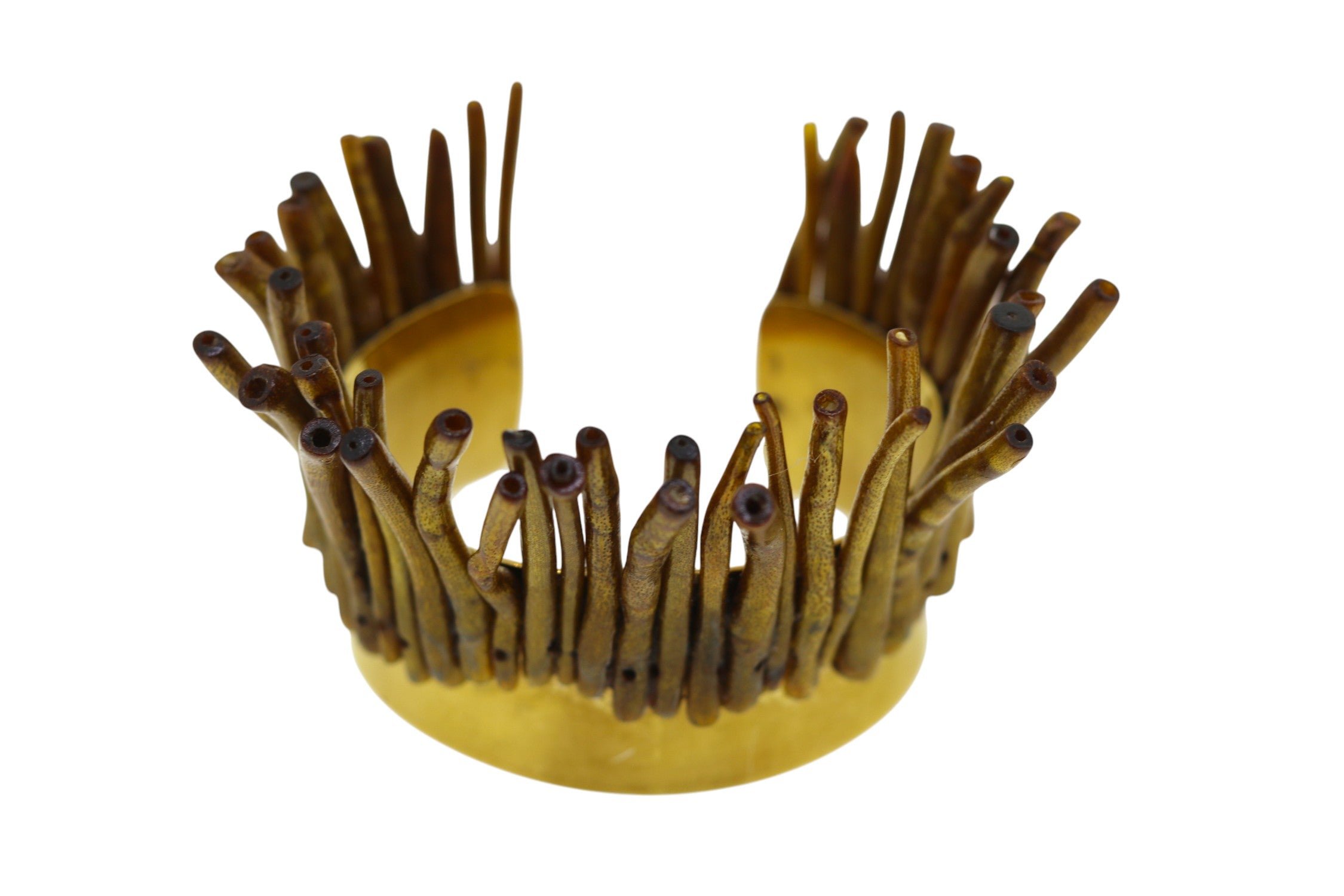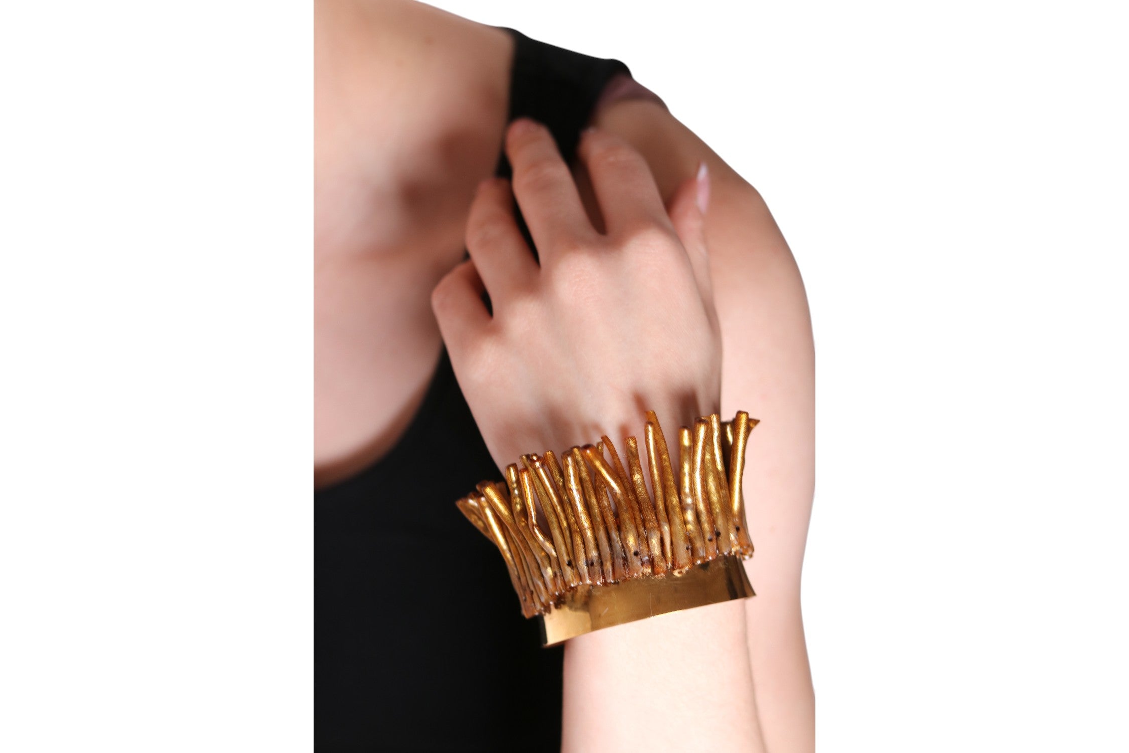 A bold statement cuff edged in an organic row of hand-tinted coral and plated in 23k Gold.
