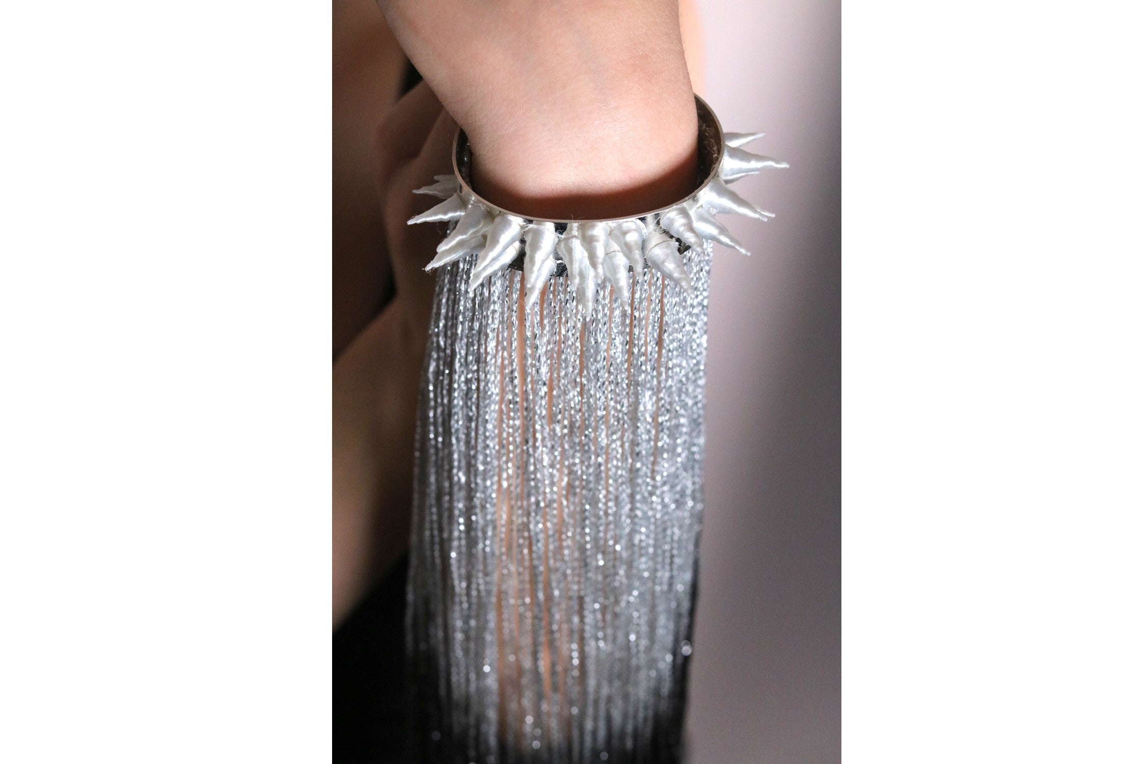 Designed in collaboration with Karina Bond, this spiked cuff features long ombre fringe on a base finished in Sterling Silver plating.