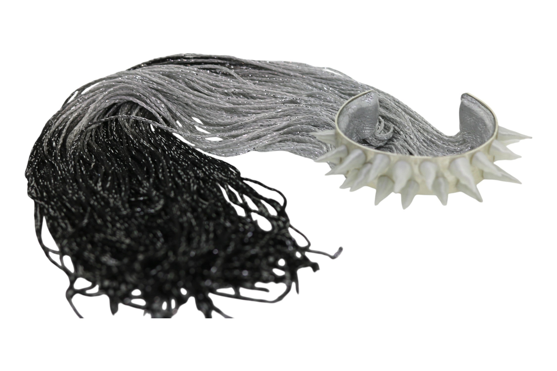 - Materials: Sterling Silver plated Nickel-free Brass, textile fringe and 3d printed acrylic.