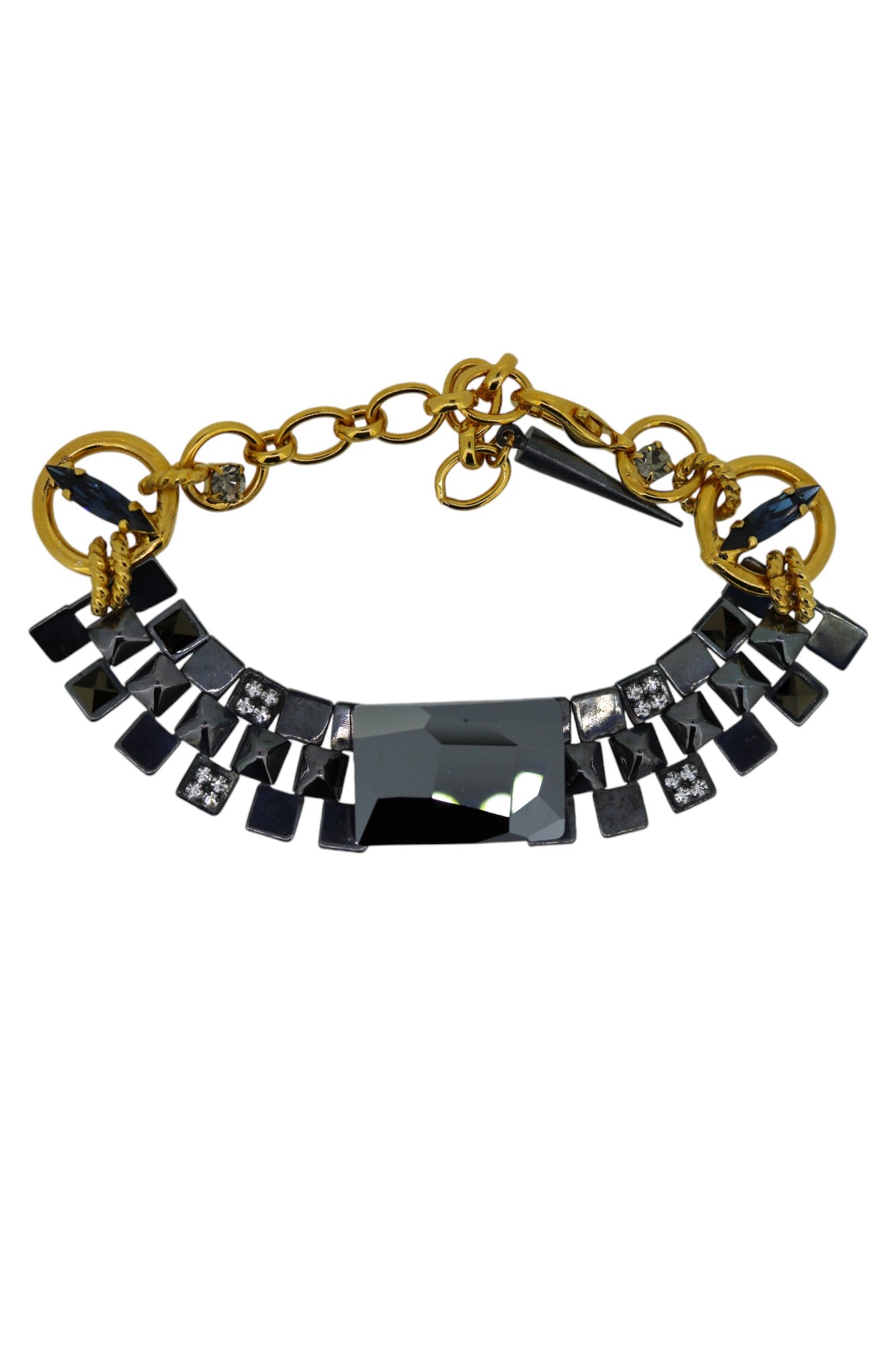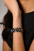 Cristales negros como la tinta flotan sobre una cadena flexible bañada en plata de ley envejecida. Una cadena bañada en oro cubre la parte posterior de la muñeca y termina en una púa.