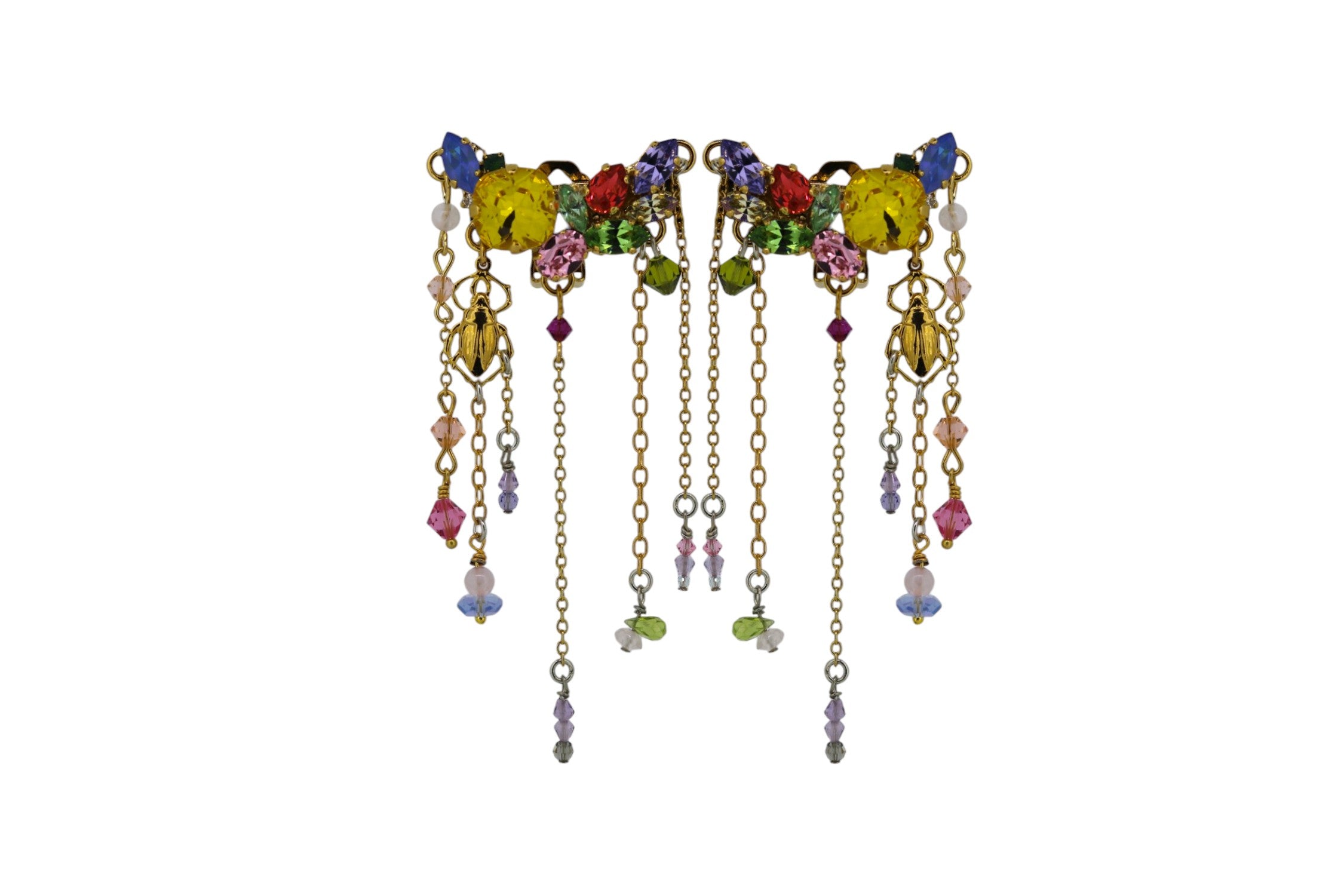 These captivating dangling demi-cuff earrings are a luxurious fusion of elegance and whimsy. Plated in radiant 23k Gold, each piece features a graceful curve that hugs the ear, embedded within the golden base are brilliant yellow and multicolour crystals, sparkling with every movement and catching the light in an enchanting prism of hues.