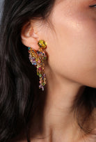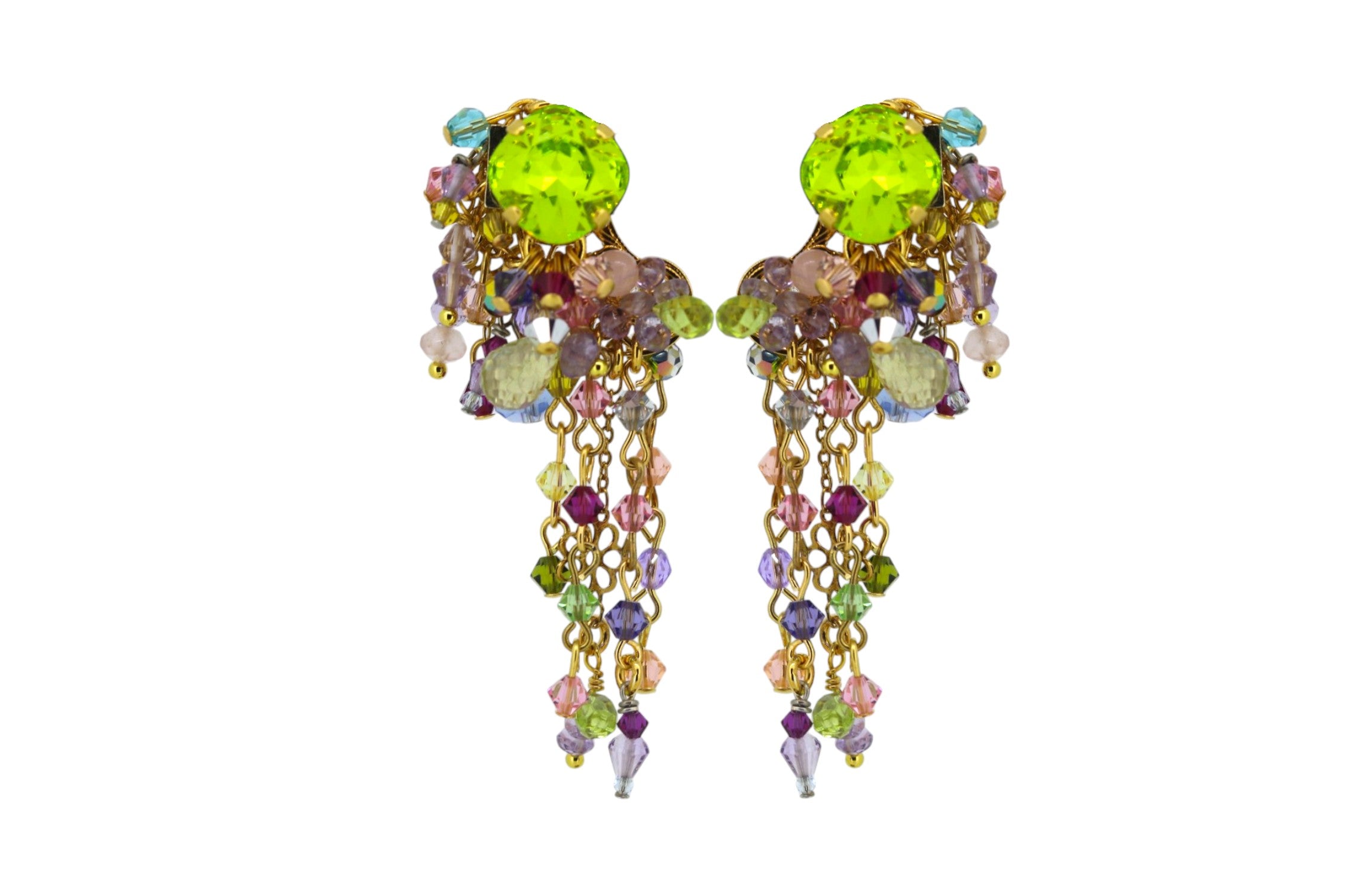 These striking ear jackets are a bold yet elegant statement, featuring large green cushion-cut crystals that radiate depth and brilliance. Mounted on 23k Gold plating, the fresh green crystals sit at the front of the ear, while cascading strands of crystal and semi-precious beads descend from behind, creating a mesmerising sense of movement.