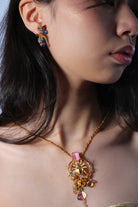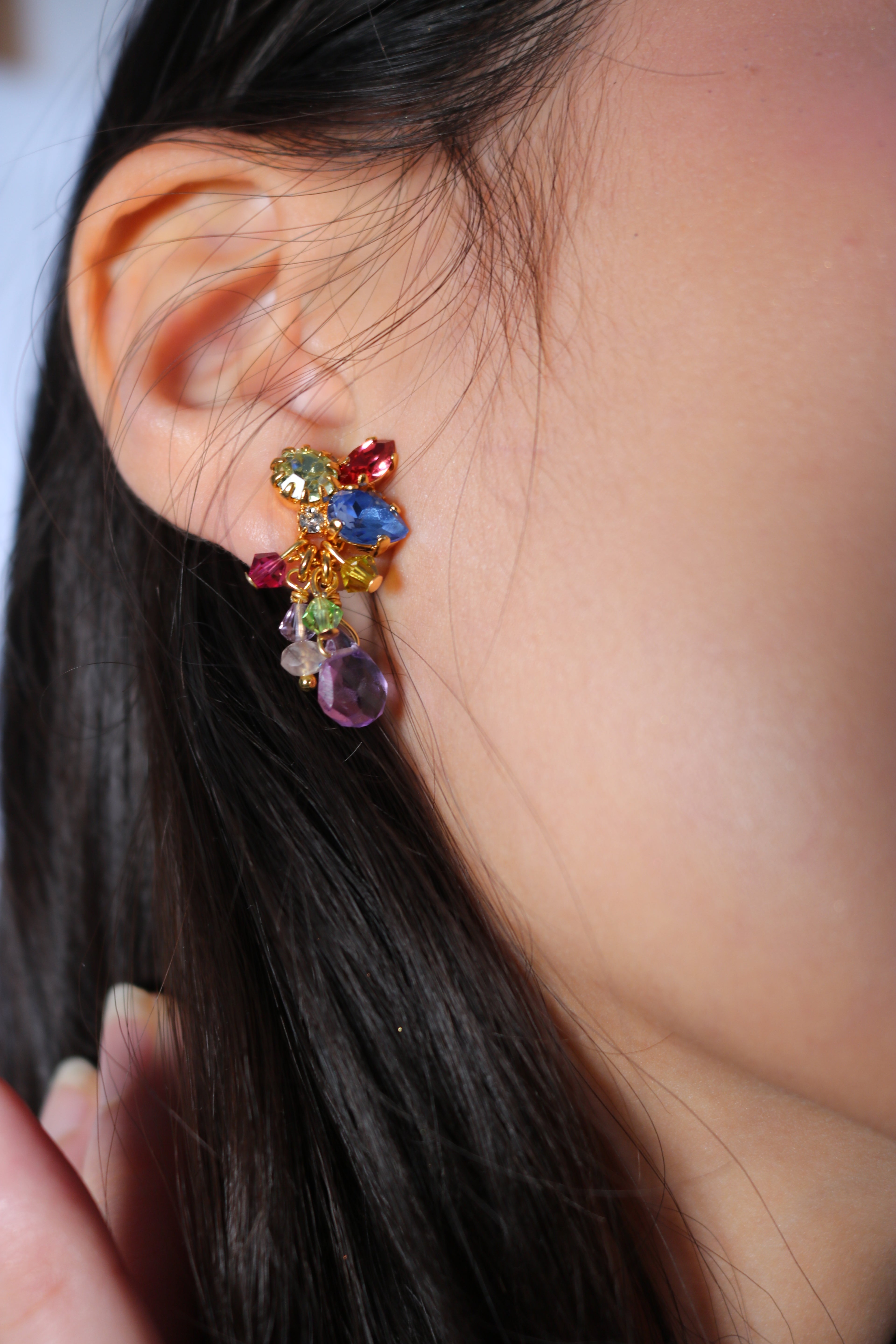 These elegant 23k Gold plated earrings feature a delicate cluster of Premium Austrian Crystals, shimmering with brilliance. Suspended beneath, semi-precious droplets add a graceful touch, catching the light with every movement.