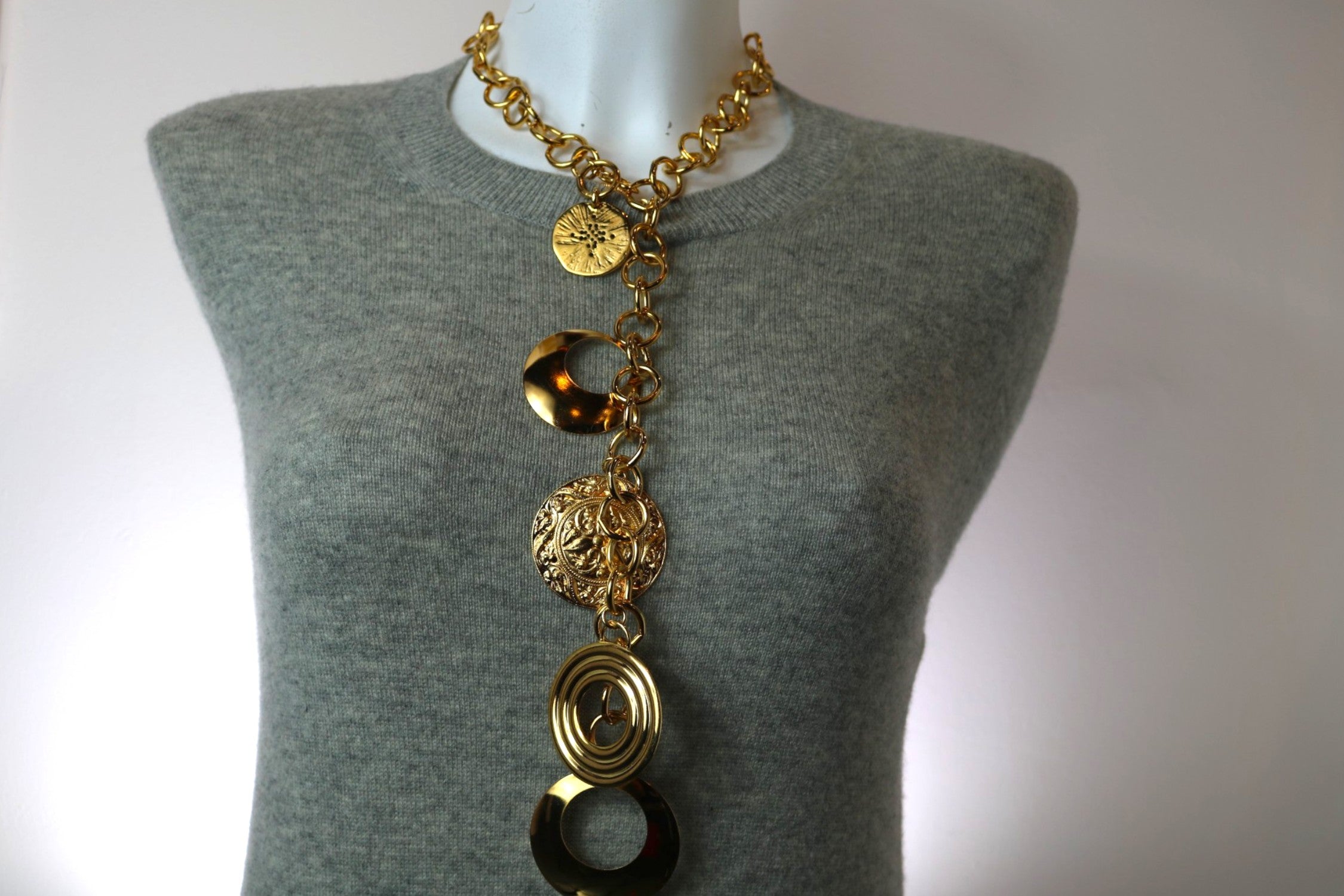 This oversized charm choker is a bold and opulent statement piece, designed to capture attention. Each charm is meticulously designed to add depth and intrigue, while the elongated pendant creates a striking silhouette that draws the eye.