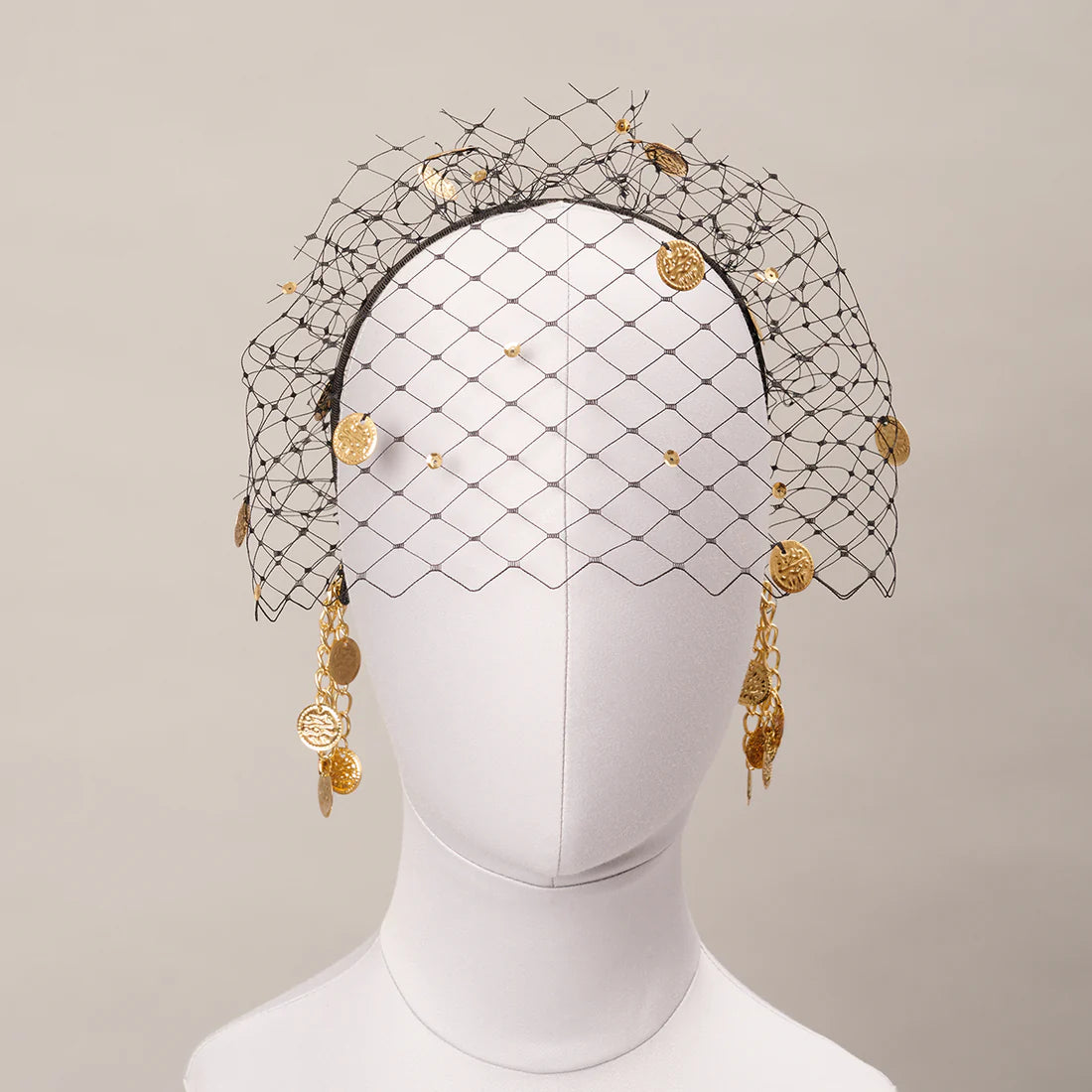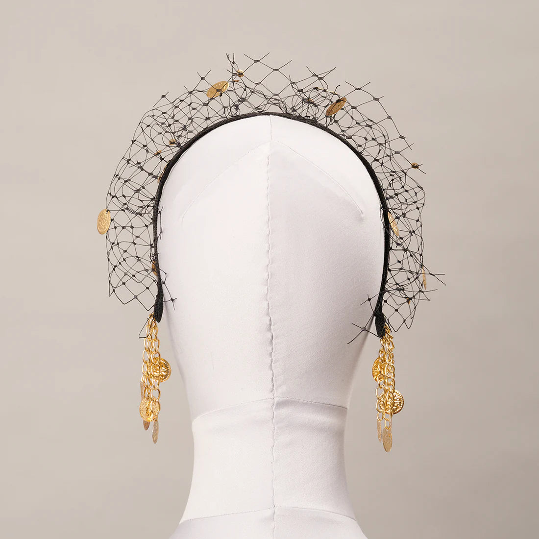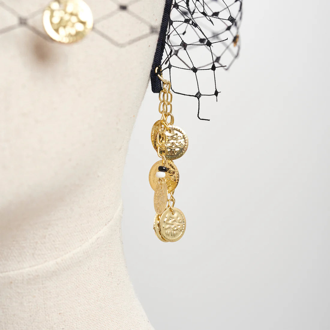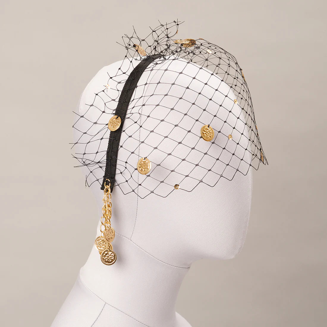 Deslúmbralas con Kezia, un velo de viuda alegre que cubre la mitad del rostro con monedas de oro y lentejuelas y que se completa con sus propios "aretes" colgantes de monedas. Montado sobre una diadema Petersham negra*.