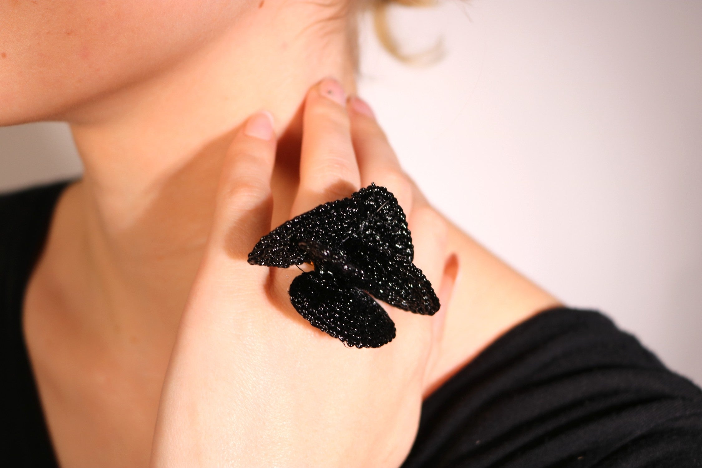 Designed in collaboration with Karina Bond, this bold statement ring features an inky black 'dessert rose' atop an adjustable, 23k Gold plated band.