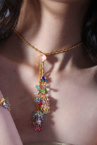 The combination of the lustrous gold, vibrant hand-tinted crystal, and the soft, shimmering beads creates a refined and captivating piece, perfect for adding a touch of sophisticated charm to any look.