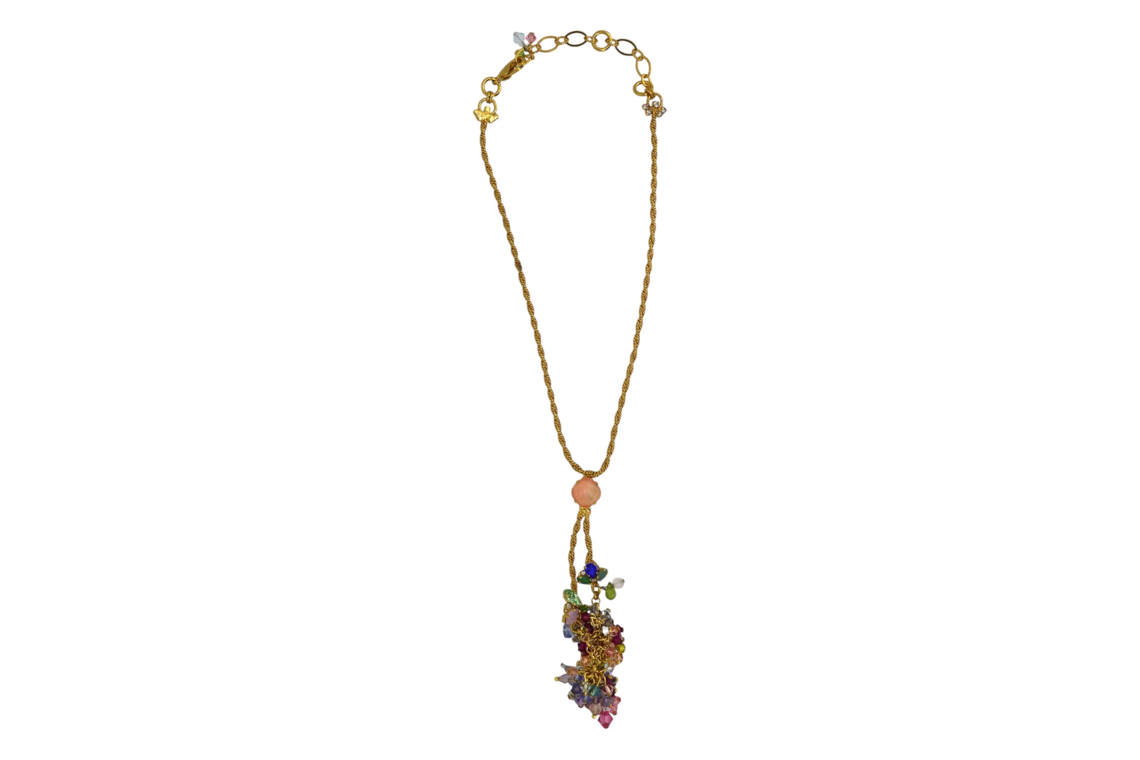 This elegant lariat necklace features a beautifully twisted 23k Gold-plated chain, its fluid design creating a graceful sense of movement. Secured together with a hand-tinted crystal, the necklace elegantly drops and terminates in delicate bunches of crystal and Semi-Precious beads that gently sway with every movement.