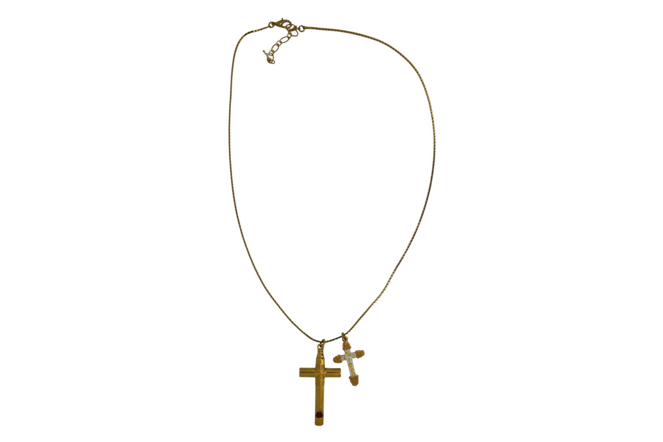 Delicate 23k Gold plated chain and cross whistle with accompanying enamelled white 'VALIDATED' cross.