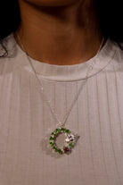 This striking Sterling Silver-plated hoop pendant necklace features an intricate design with a delicate rose motif and a bug motif, both beautifully adorned with Premium Austrian crystals. The hoop pendant gently frames the motifs, while the crystals add a brilliant sparkle, bringing the floral and insect details to life.