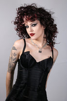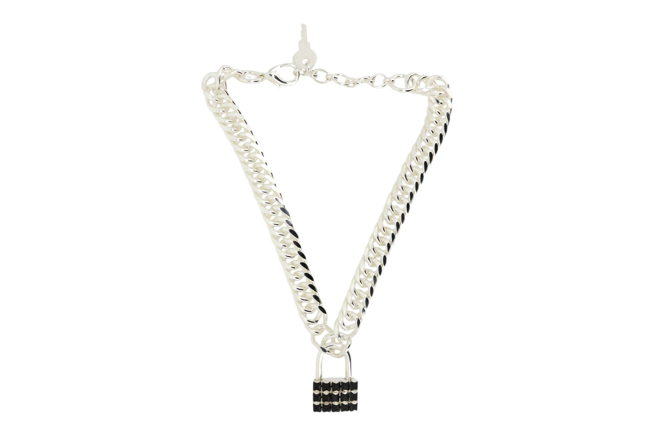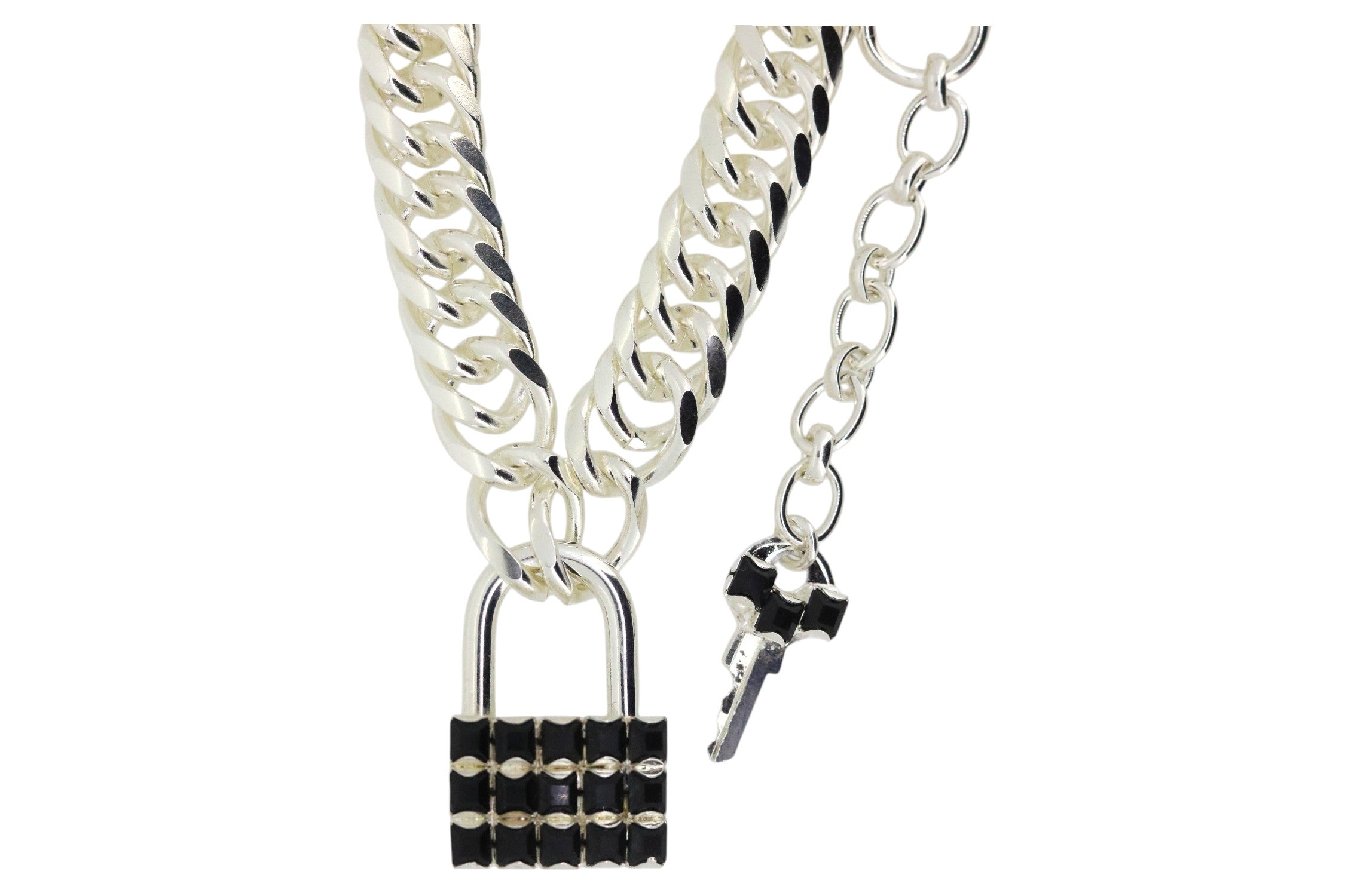 Glossy black crystal-paved lock pendant suspended from thick curb chain plated in Sterling Silver.