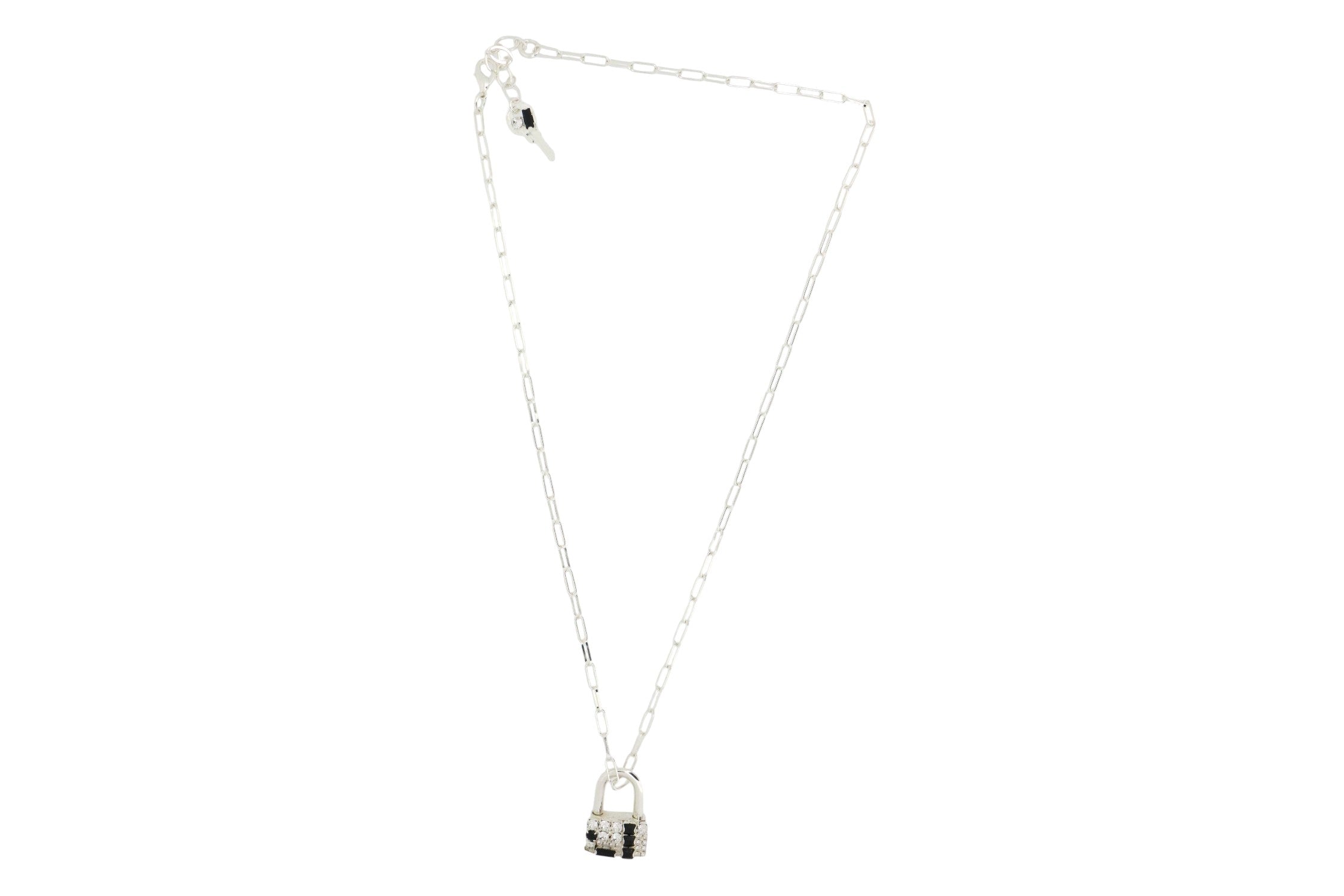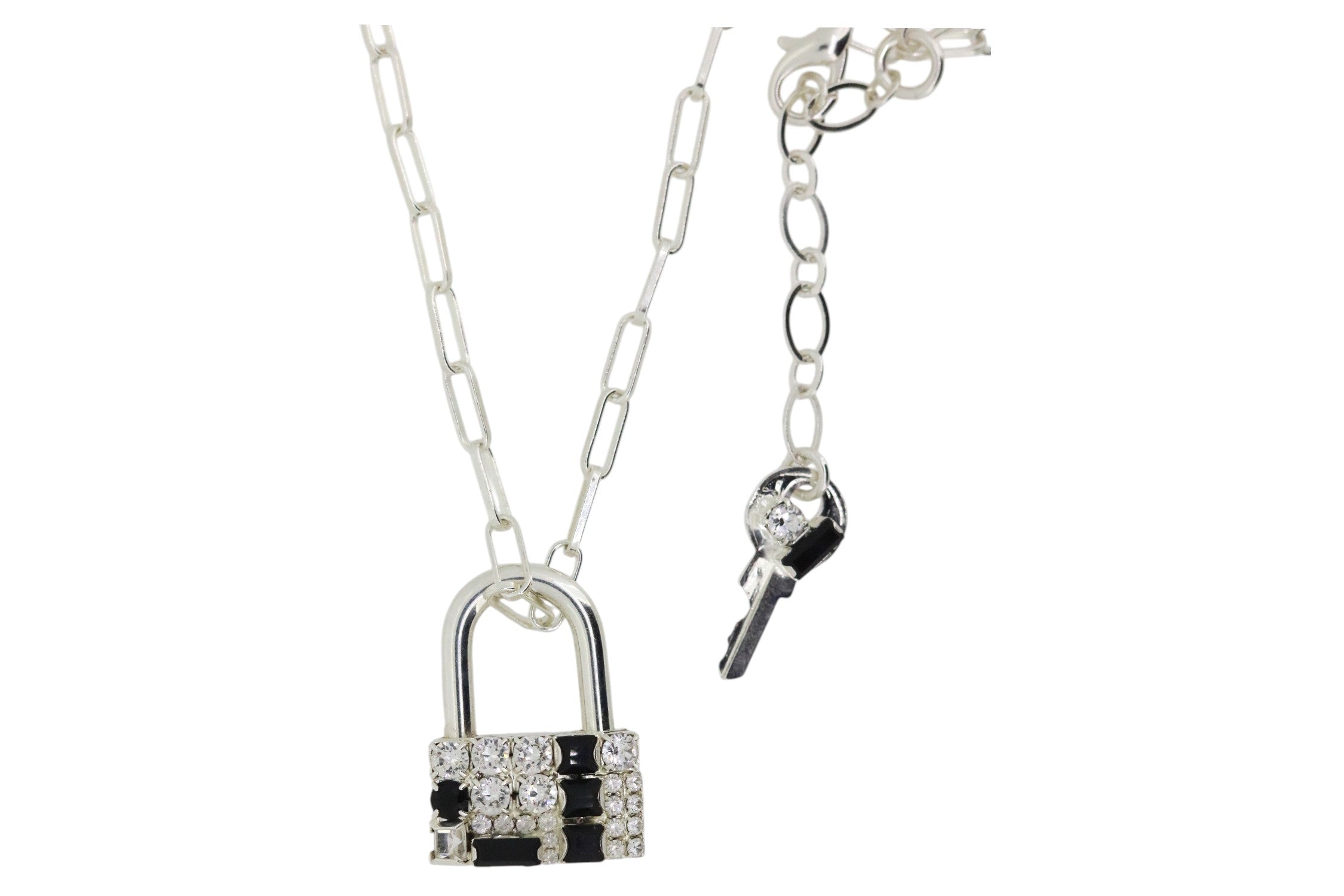 Black and white crystal embellished lock, plated in Sterling Silver and suspended from a minimalist paperclip chain.