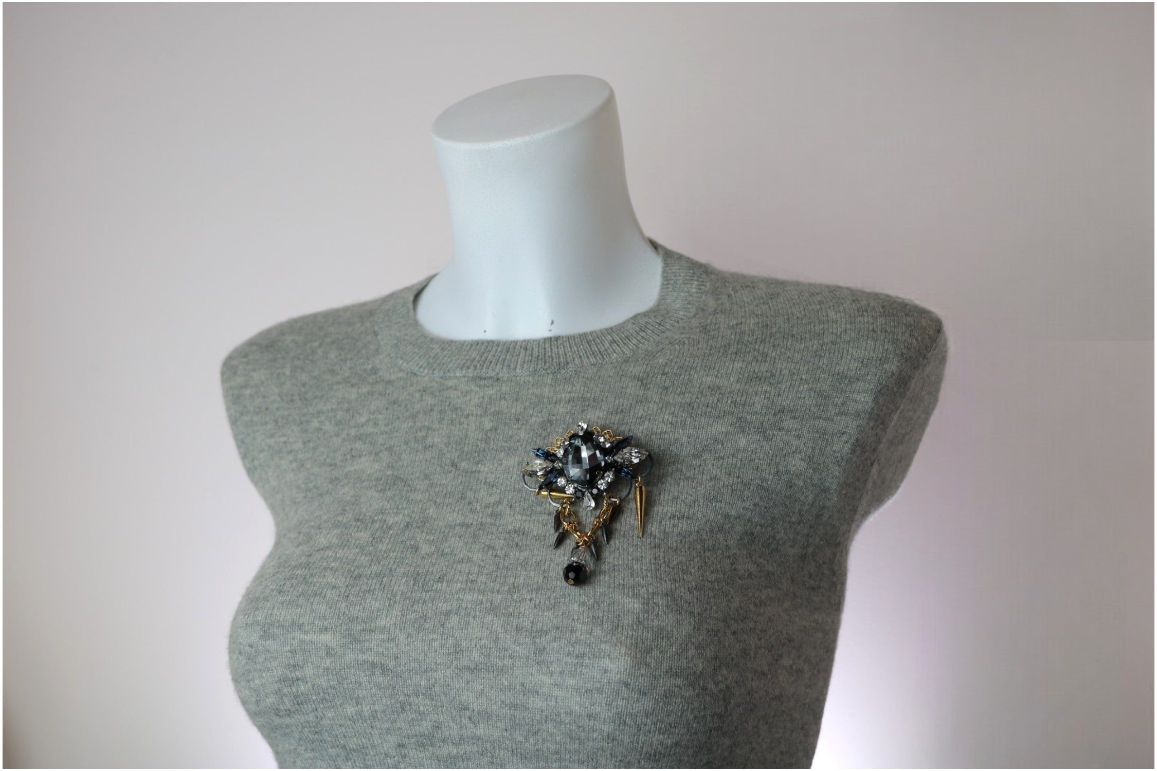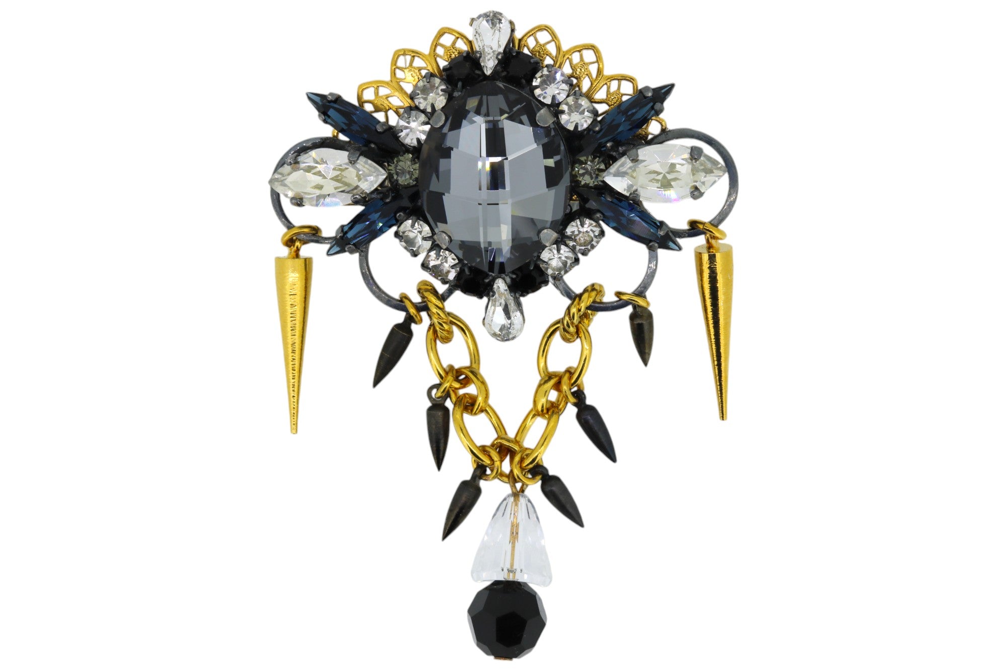 Inspirado en un corsage vanguardista del siglo XIX, este broche combina una forma clásica con influencias punk clásicas de VICKISARGE. Un grupo central de cristales sostiene una guirnalda de cadenas con púas de metal combinadas.