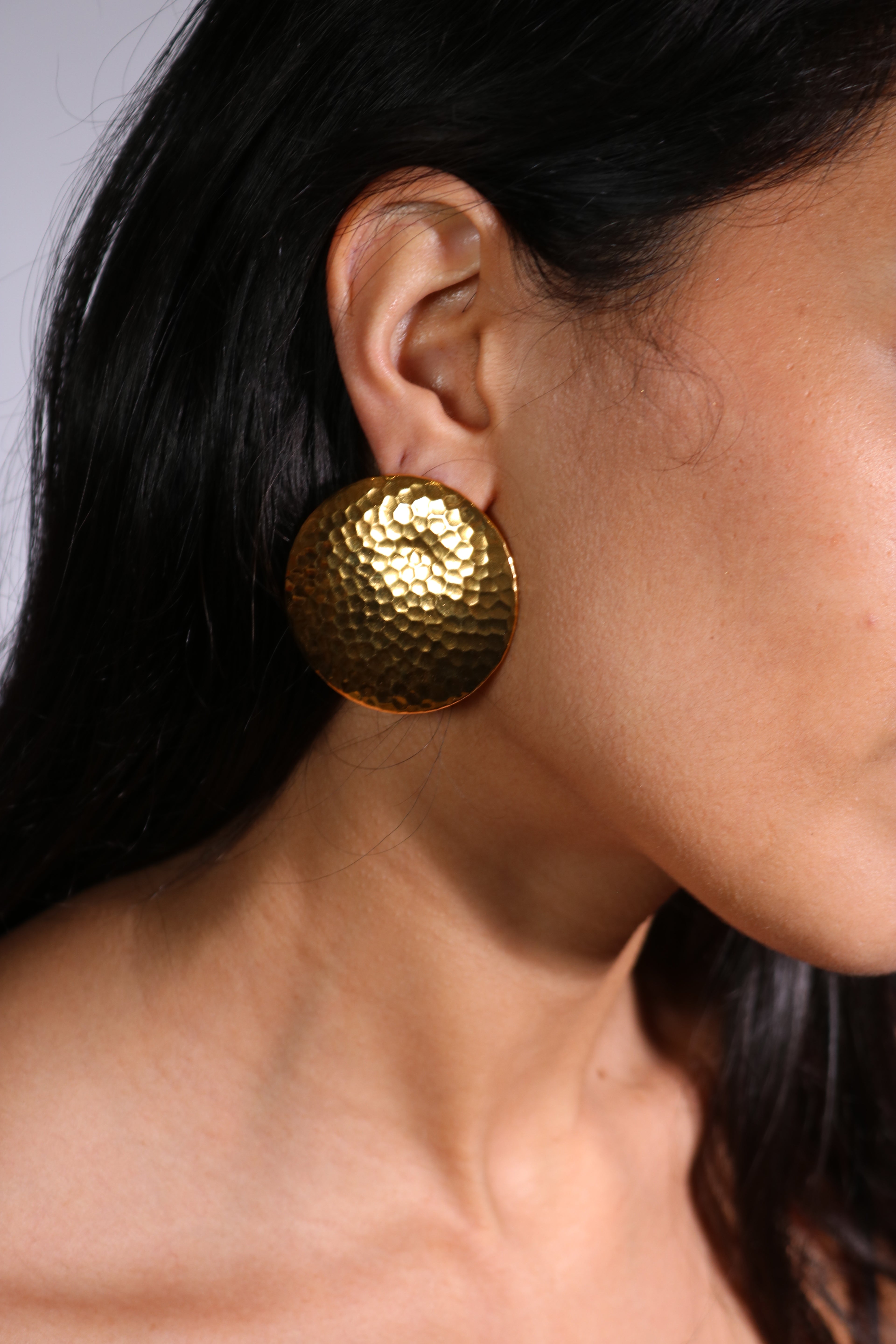 Estos pendientes, con un intrincado acabado martillado contemporáneo y un lujoso baño de oro de 23 quilates, están hechos a mano en nuestro taller de Kensington. Son perfectos para cuando quieres hacer una declaración y son adecuados tanto para el día como para la noche.
