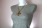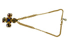 Este collar adornado presenta una gran cruz adornada con cristales en tonos vibrantes y piedras semipreciosas. Esta pieza, colocada sobre una intrincada base de filigrana y bañada en oro, irradia una lujosa elegancia, perfecta para hacer una declaración espectacular.